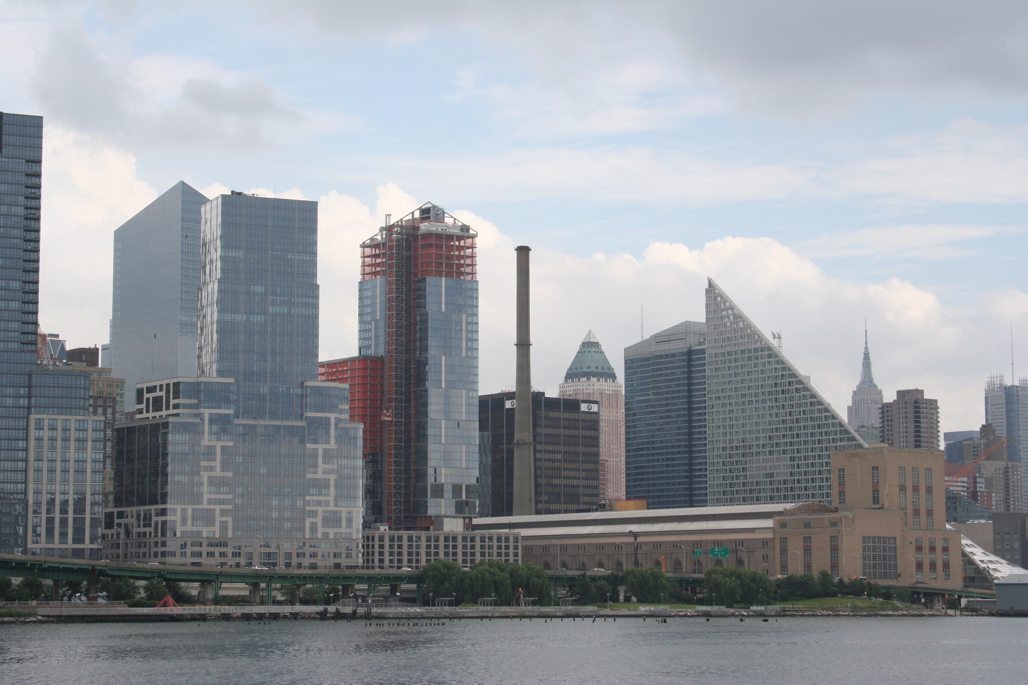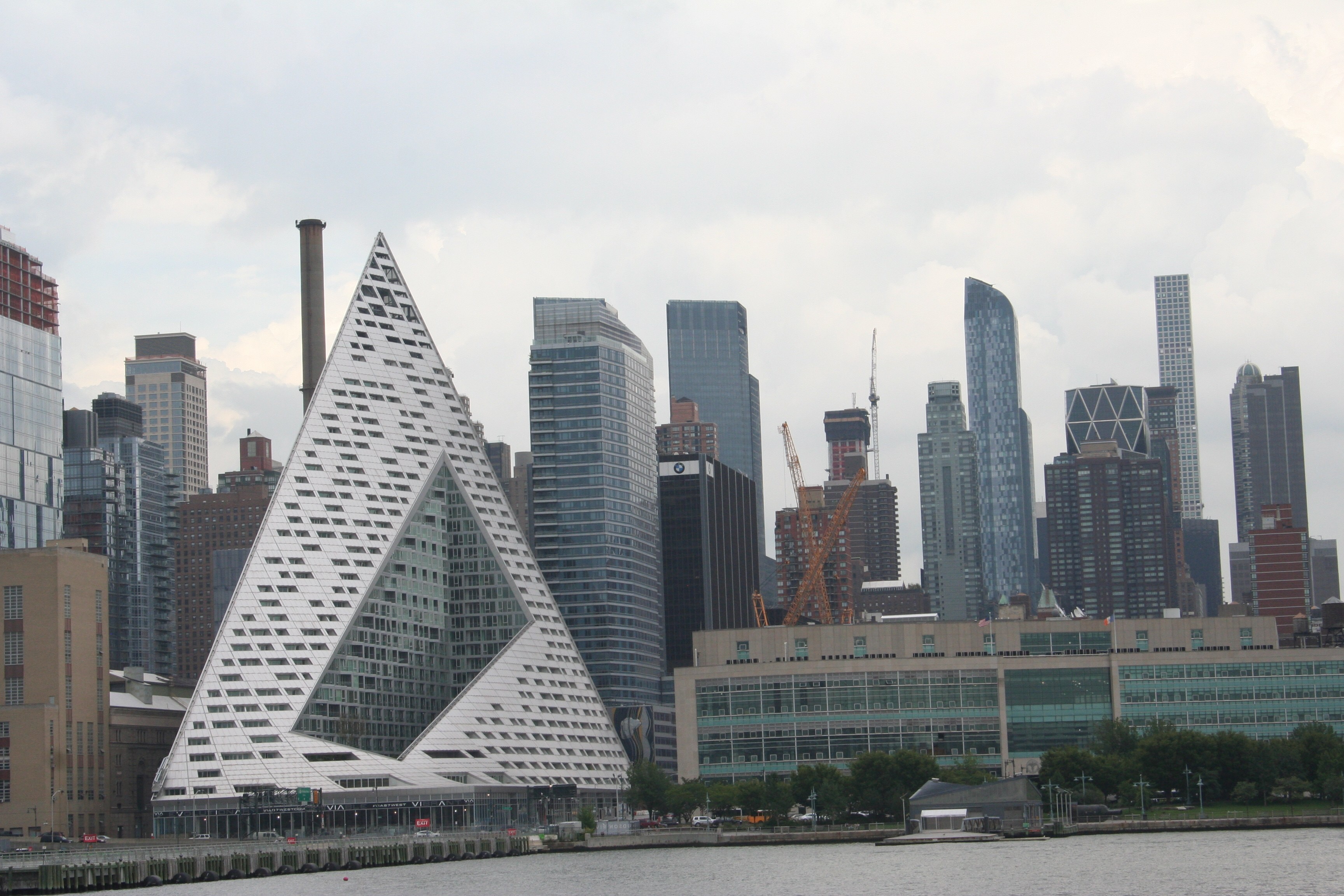 I love different, odd, and unique architecture. Do you see that square, black, Allianz building there just to the right of center? It’s not different, odd, or unique. It’s boring. but the twisty, turny building next to it that’s built like a ramp? That’s apparently the Mercedez Benz building and being built that way it creates about three dozen penthouses instead of one or two, all with a great view of the city, the river, and New Jersey beyond.. However much those penthouses cost, I’m sure that I won’t be buying one any time soon!