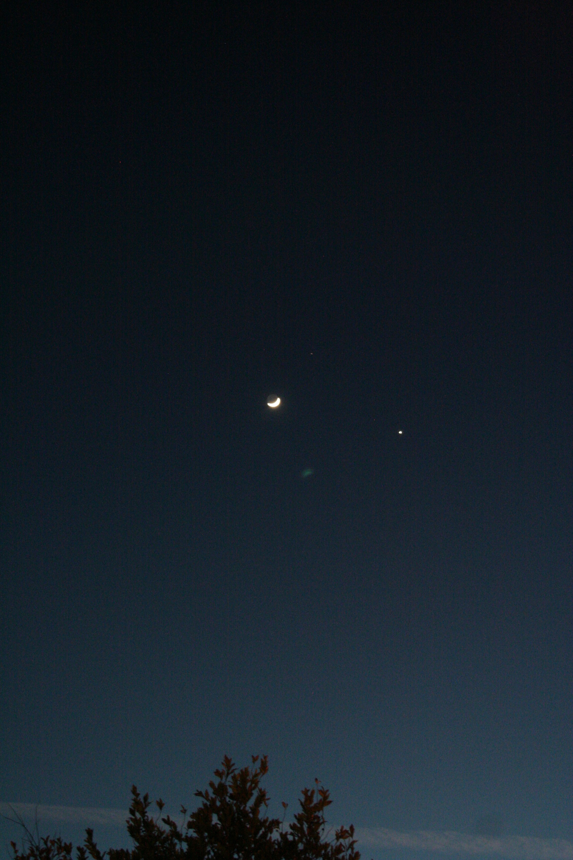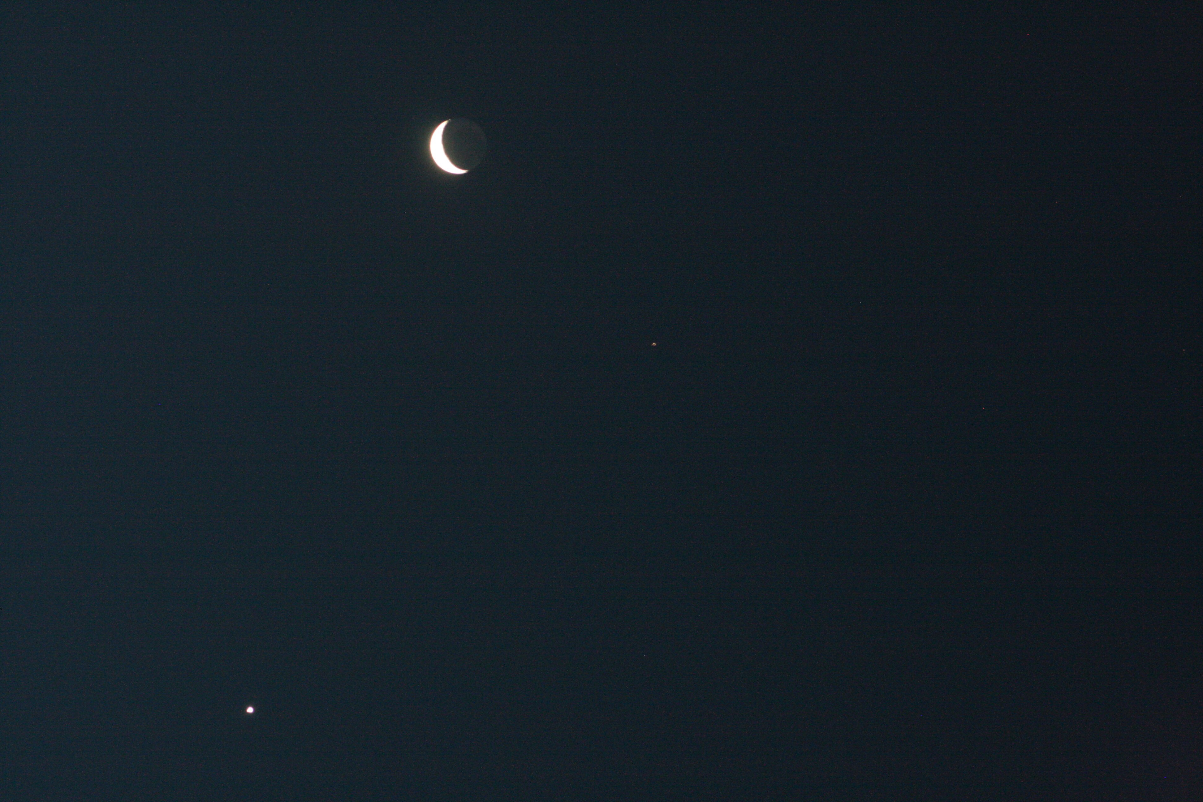 It was a bit darker when I went out tonight, so it’s easier to pick up Mars. It’s just above center here, with Venus on the bottom, the Moon, at the top, and the Sun somewhere way over to the left. Obvious to us, but not so to the ancients. We might have a slightly more accurate worldview than they did.