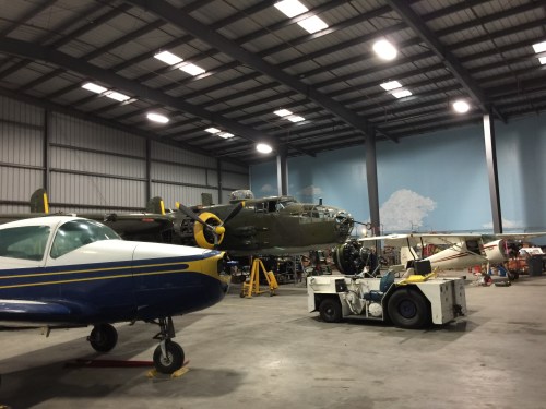 Inside the maintenance hangar, there was work going on on our F-24 (just out of sight on the right), our new Navion (white, blue, and yellow), the AAF’s B-25 Executive Suite (they lease space from us in our new hangar), and a plane I honestly am not familiar with (the white one with the red stripes) but think might belong to a CAF wing member.
