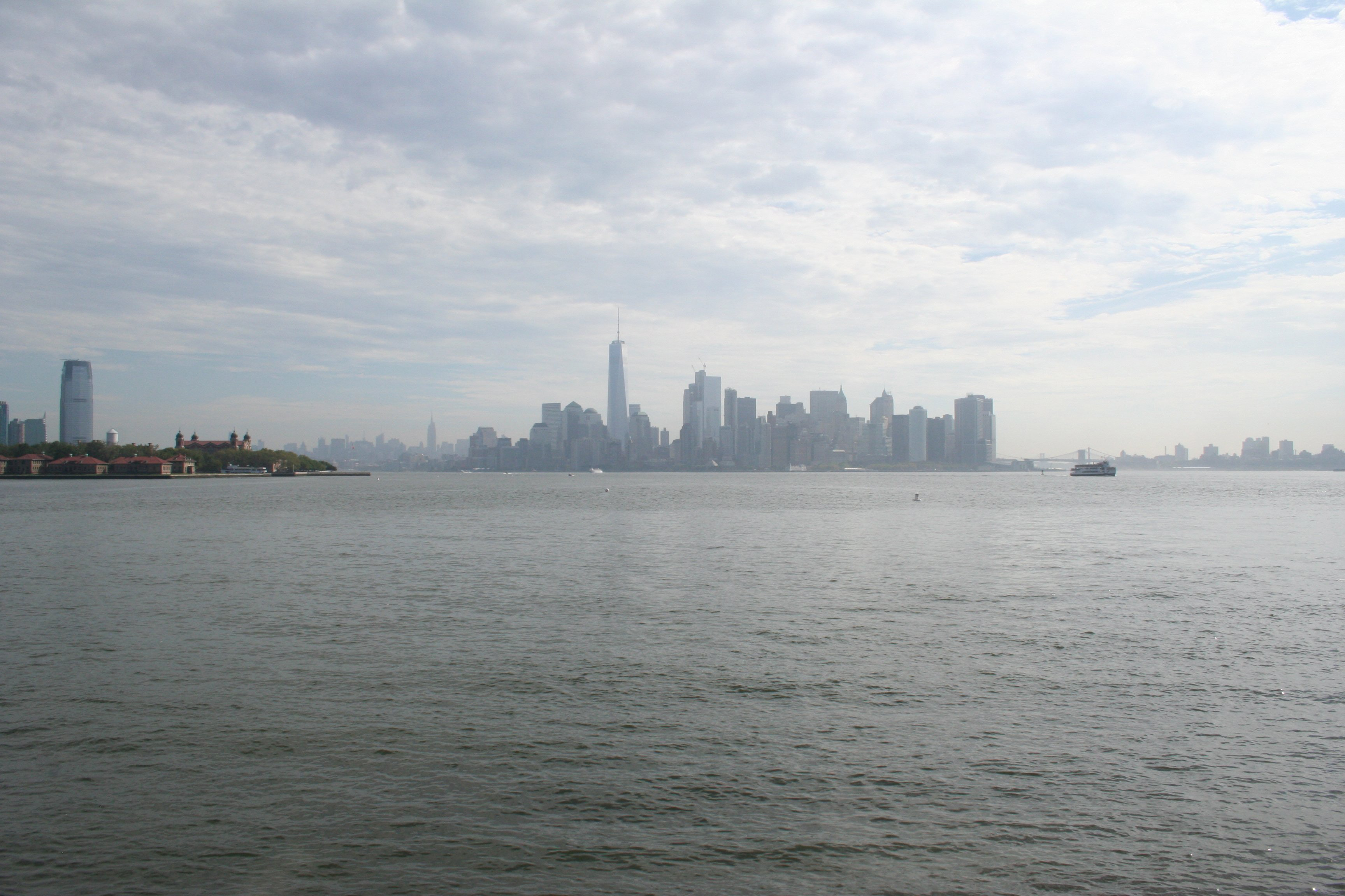 From Liberty Island, the skyscrapers of Manhattan look like a mountain range rising out of the sea. In the haze over on the left you can see the Goldman Sachs Tower. (“There is an evil there that does not sleep…”) In the foreground at the left is our next destination – Ellis Island.