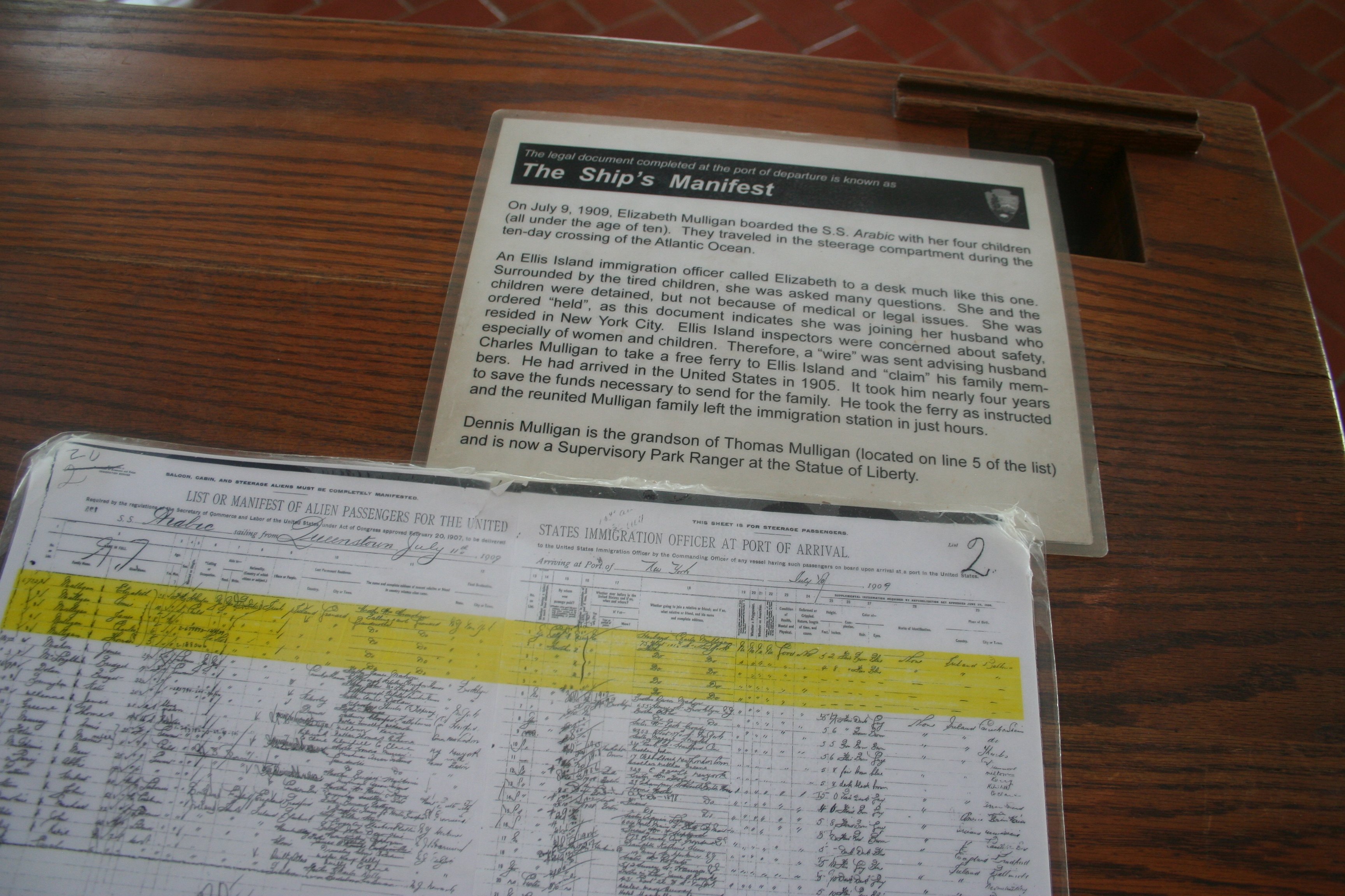 It went far beyond just random displays and artifacts. Here, for example, on the podiums at the far end of the Great Hall, the life & death decisions were made, allowing someone to enter or ordering them to be sent back out of the country. A copy of the ship’s manifest is shown, with the highlighted part showing the entry records for one of the current Park Rangers at the Statue of Liberty.