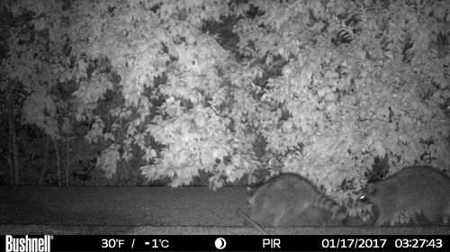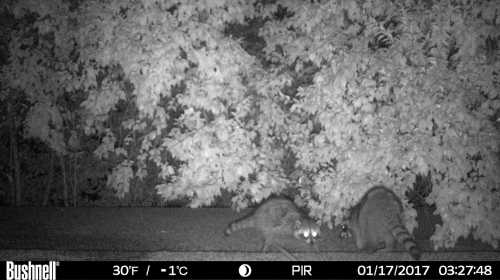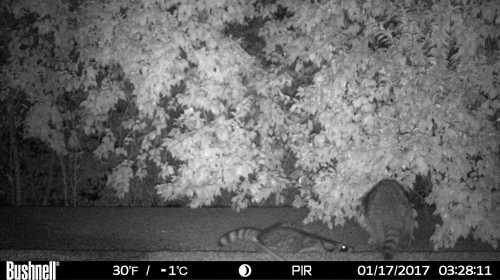 Are there raccoons up there? Let’s put it this way. It was about sunset, maybe a little after when I went out. When I unlatched and rolled open the heavy sliding glass door to the patio, which is directly under the entrance to their under-eaves hidey-hole, there was a clatter of feet above me as they scrambled back inside.