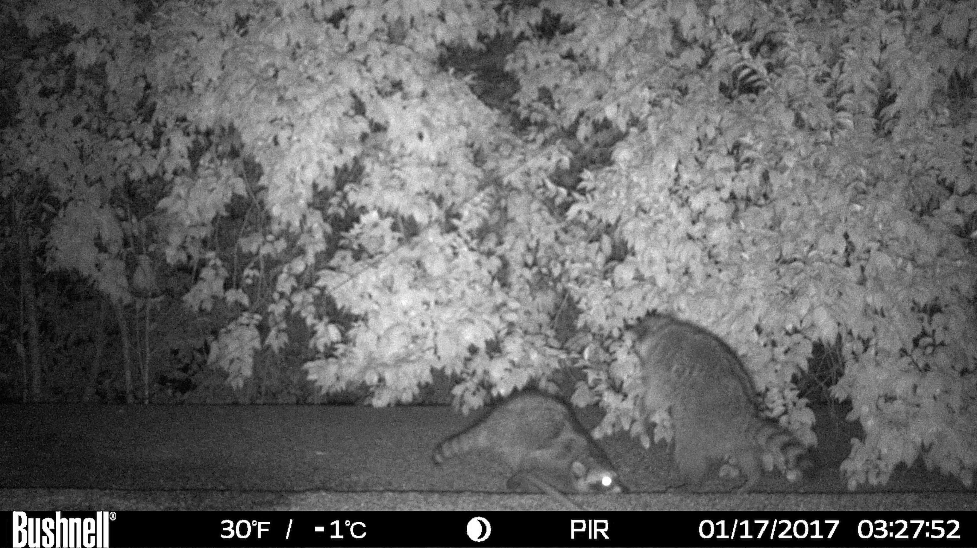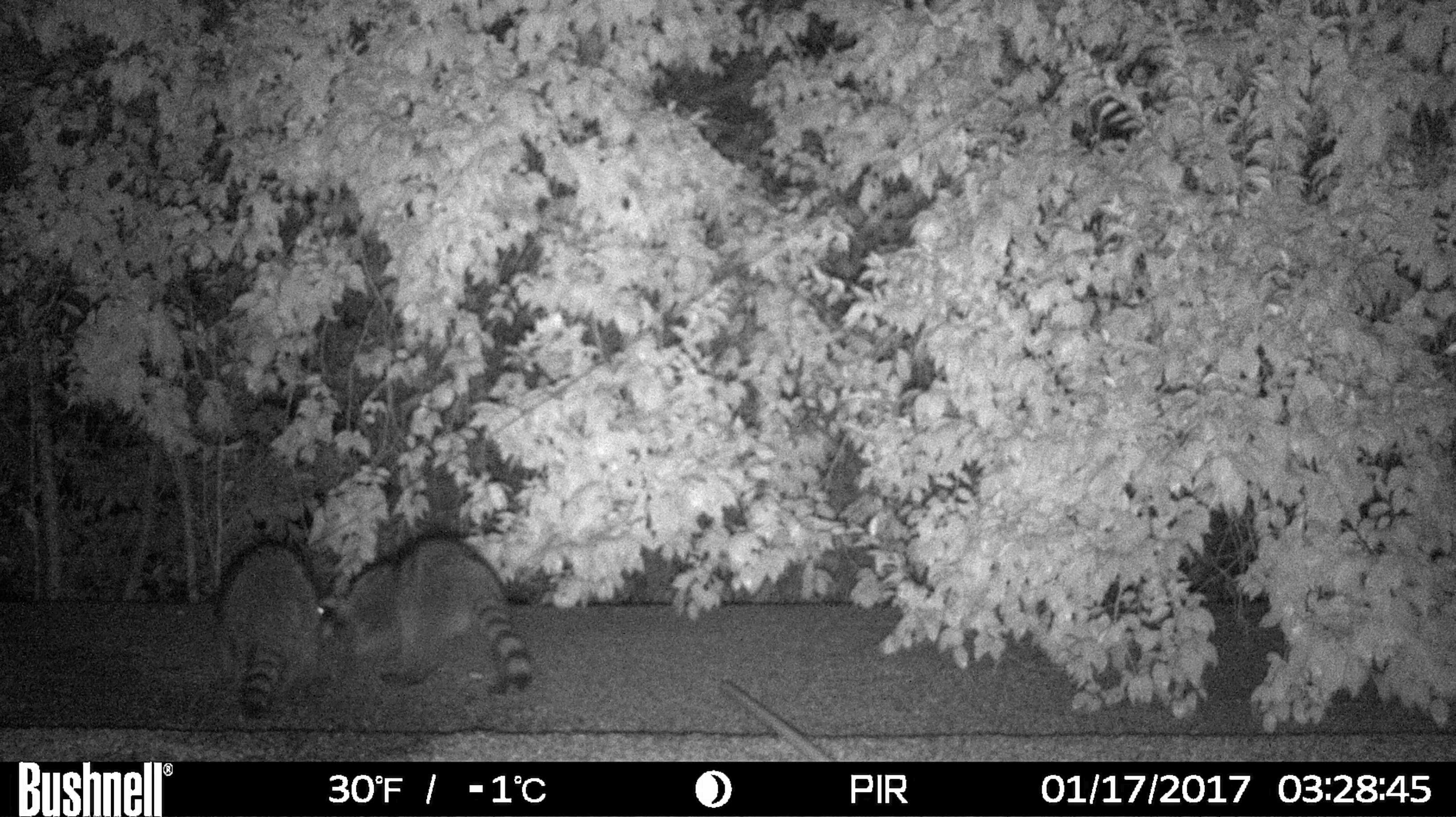 Are there raccoons up there? Let’s put it this way. It was about sunset, maybe a little after when I went out. When I unlatched and rolled open the heavy sliding glass door to the patio, which is directly under the entrance to their under-eaves hidey-hole, there was a clatter of feet above me as they scrambled back inside.