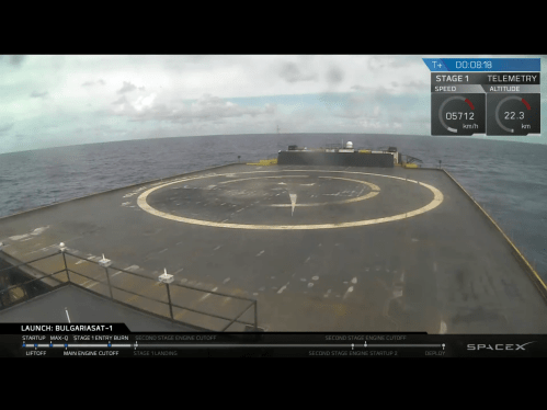 The SpaceX barge in the Atlantic Ocean is “Of Course I Still Love You,” seen here just seconds before the first stage landing. (We lost video during the actual time of landing, in large part due to the interference of having a freaking rocket come down from space on a pillar of fire!)