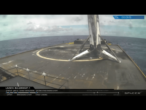 That’s terrible, isn’t it? I mean, they missed the bullseye by at least eight or ten feet! On a more serious note, you can see that the rocket is leaning just a bit. This was one of the hardest landings and the booster came down fast, hitting the deck hard. That’s okay – the legs are designed to absorb a decent amount of energy in a hard landing. We’ll see how the booster checks out when it gets back to port, but preliminary reports are that it survived the landing without any major problems.