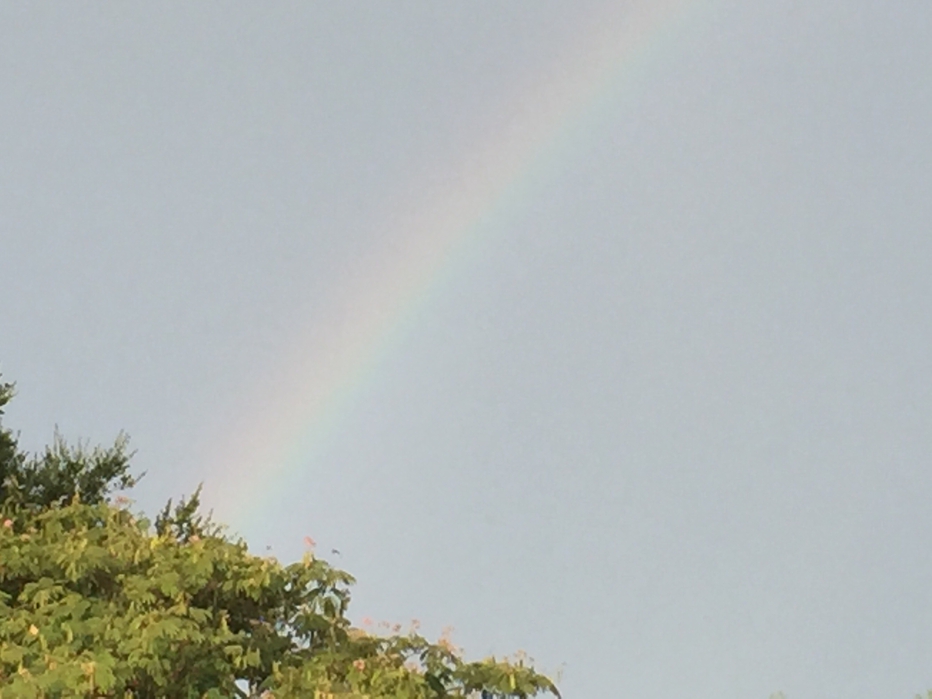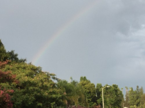 It only rained hard for about ten minutes, then passed on to our west, part of a whole lot of tropical moisture wrapping itself counterclockwise around a low somewhere way to the south of us. That put “our” shower between us and the sun at sunset – we know what that means!