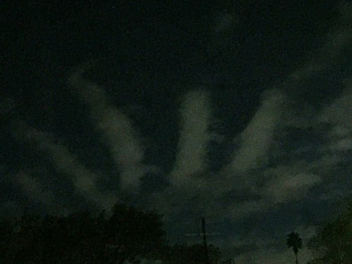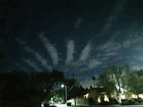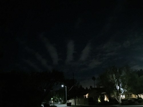 Two days late for Halloween, but tonight we got partial clearing of the coastal clouds with a bright moon to boot. I took a bag of trash out and saw these odd, somewhat parallel stripes of clouds: