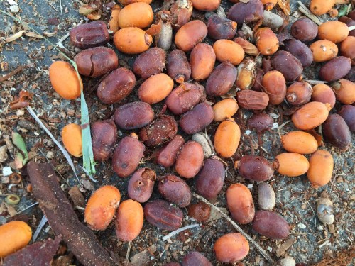After our date palm was “aggressively” pruned last week, the driveway was littered with the fruits.