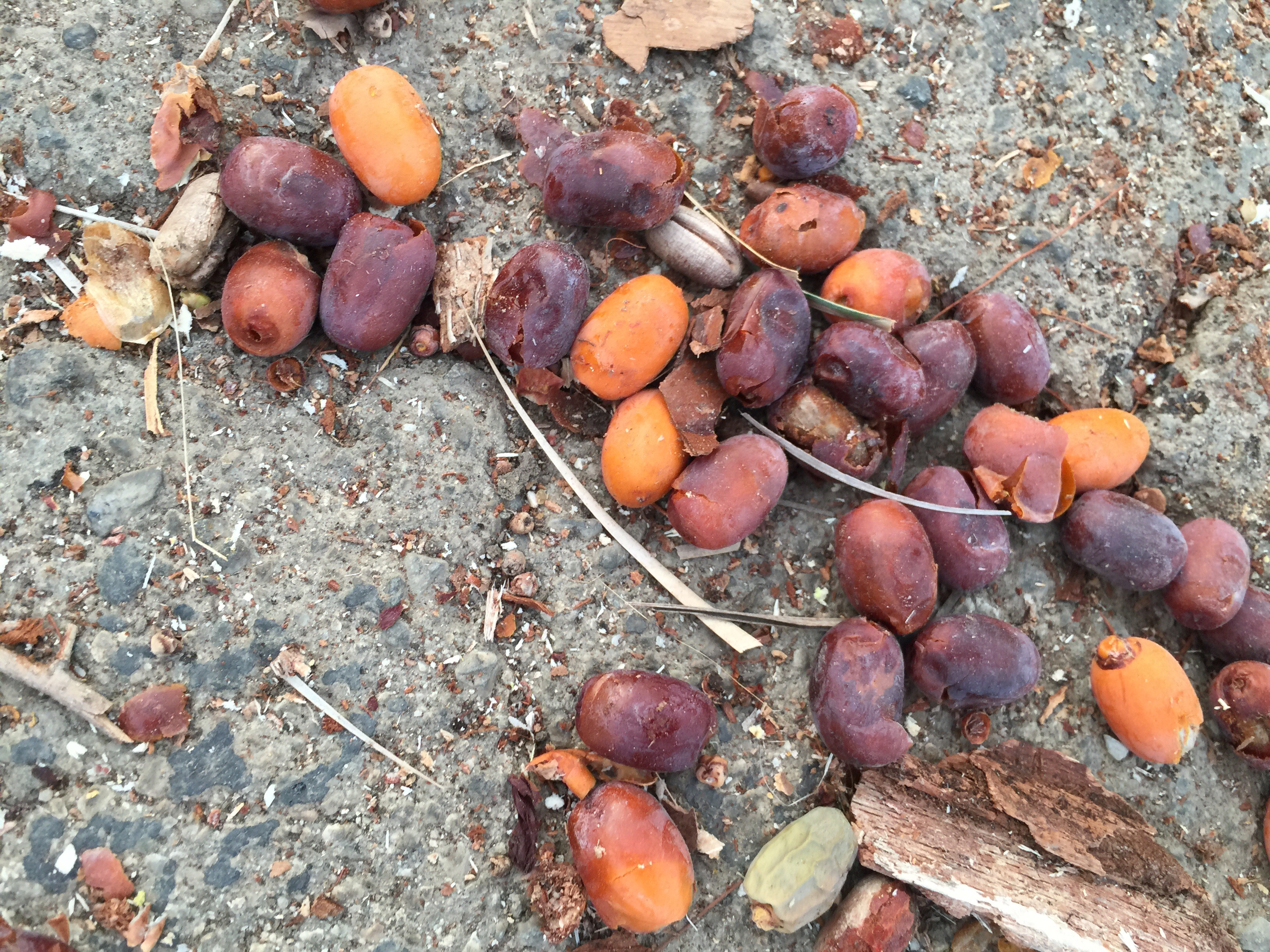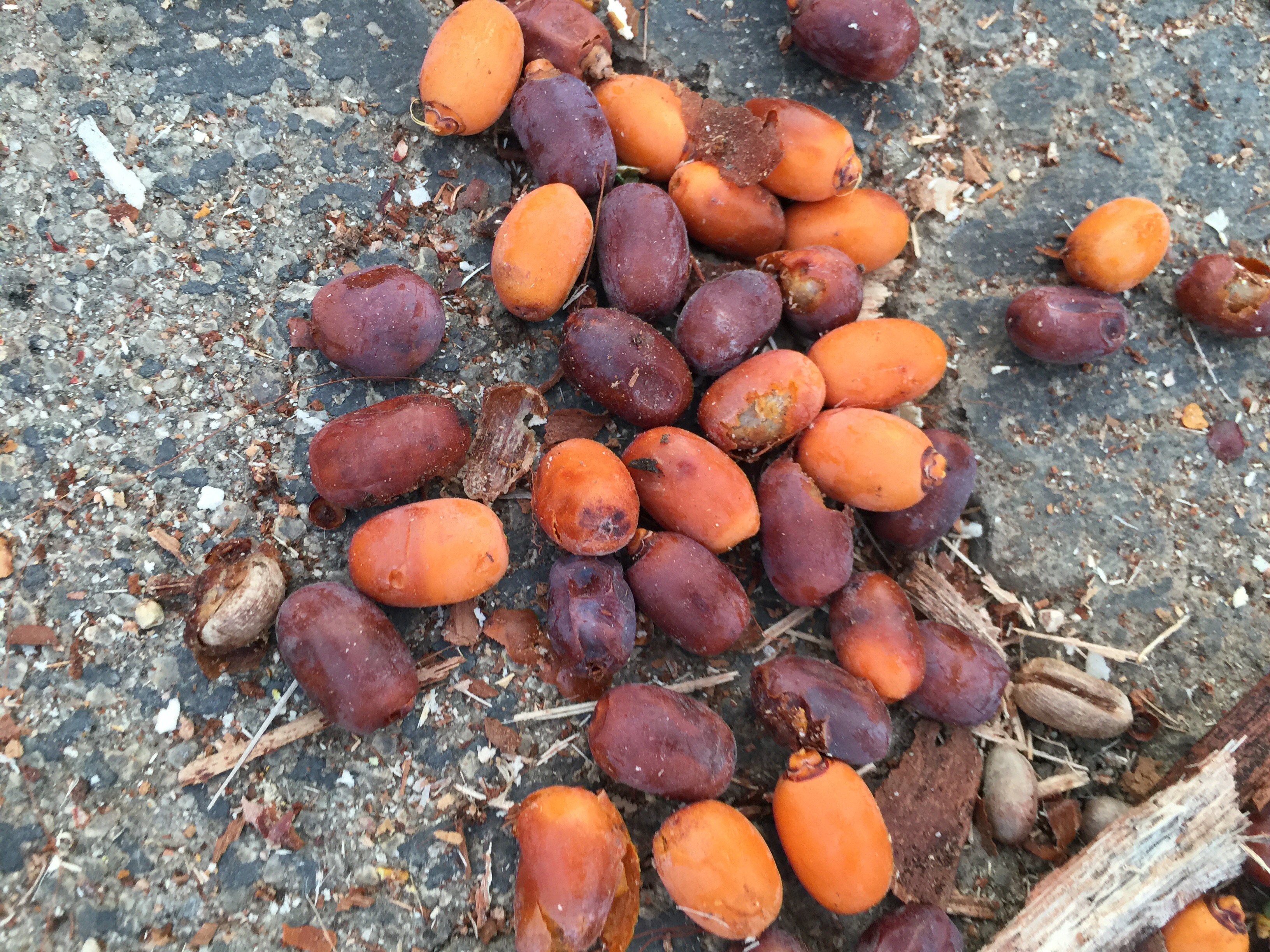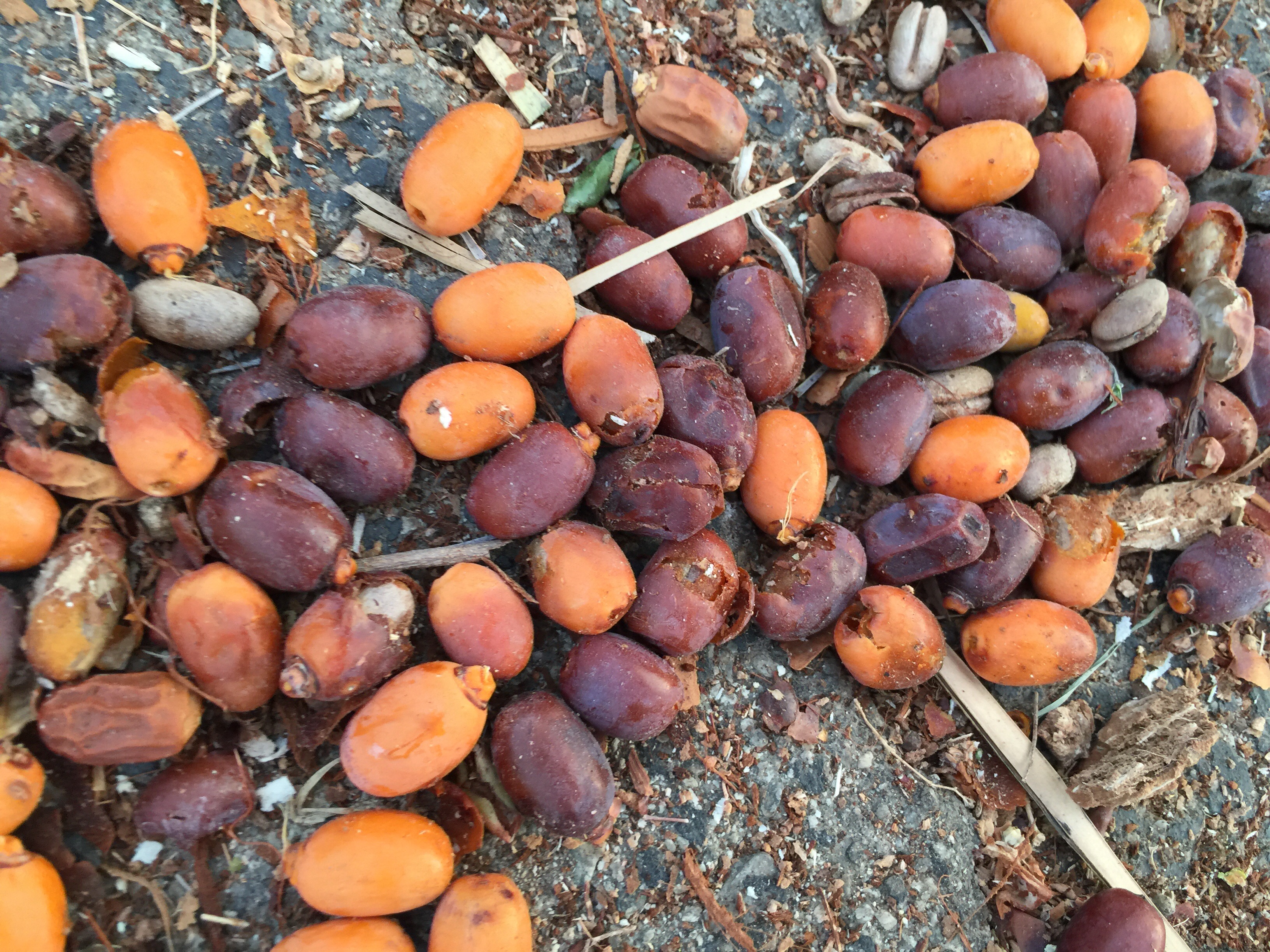 After our date palm was “aggressively” pruned last week, the driveway was littered with the fruits.