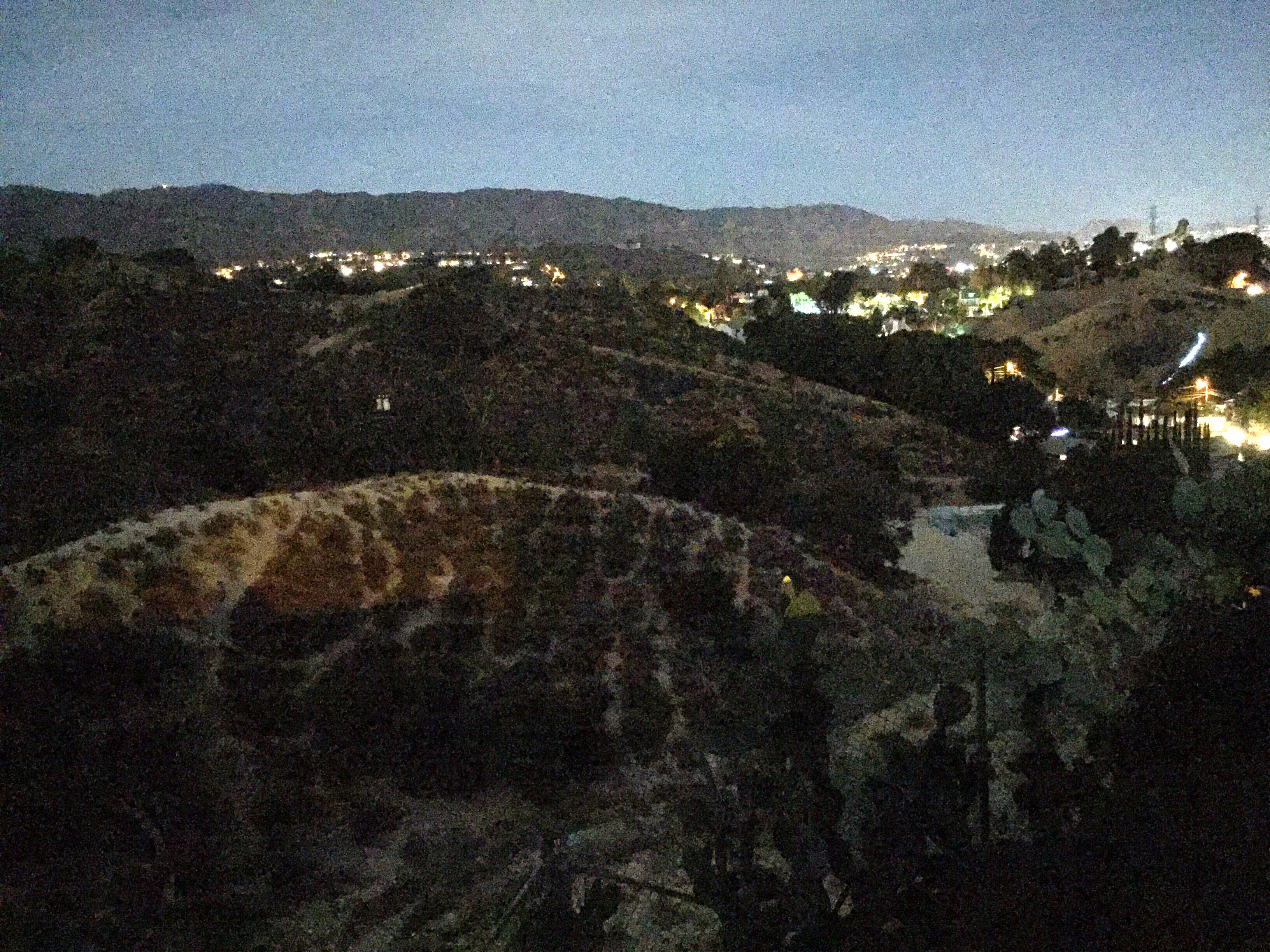 Well, at least the “Camera” app in the iPhone can’t. But there are other apps! NightCap did a much better job of showing how the entire park was lit up by the moonlight, with the lights of Santa Clarita, Valencia, and Newhall beyond: