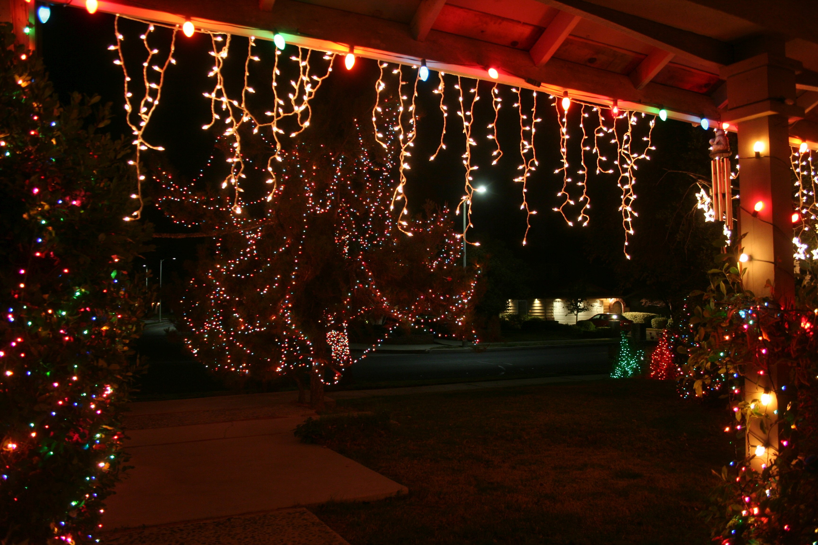 For example, the birch tree with the two strings of white stars in them would normally have those plus at least two or three strings of plain white lights and white icicle lights.