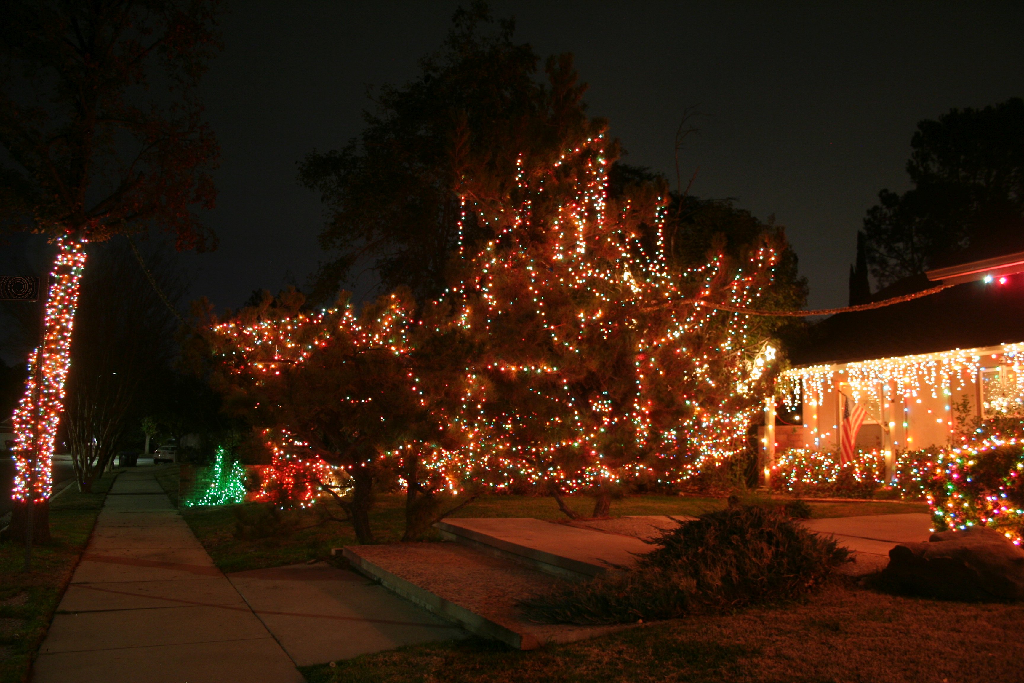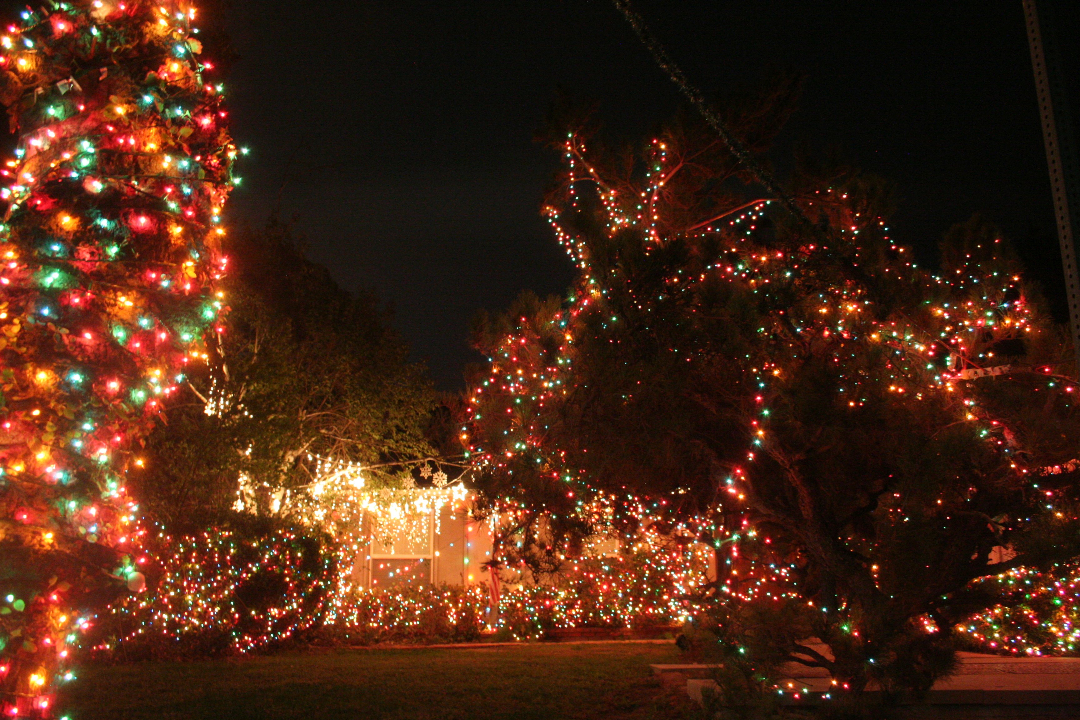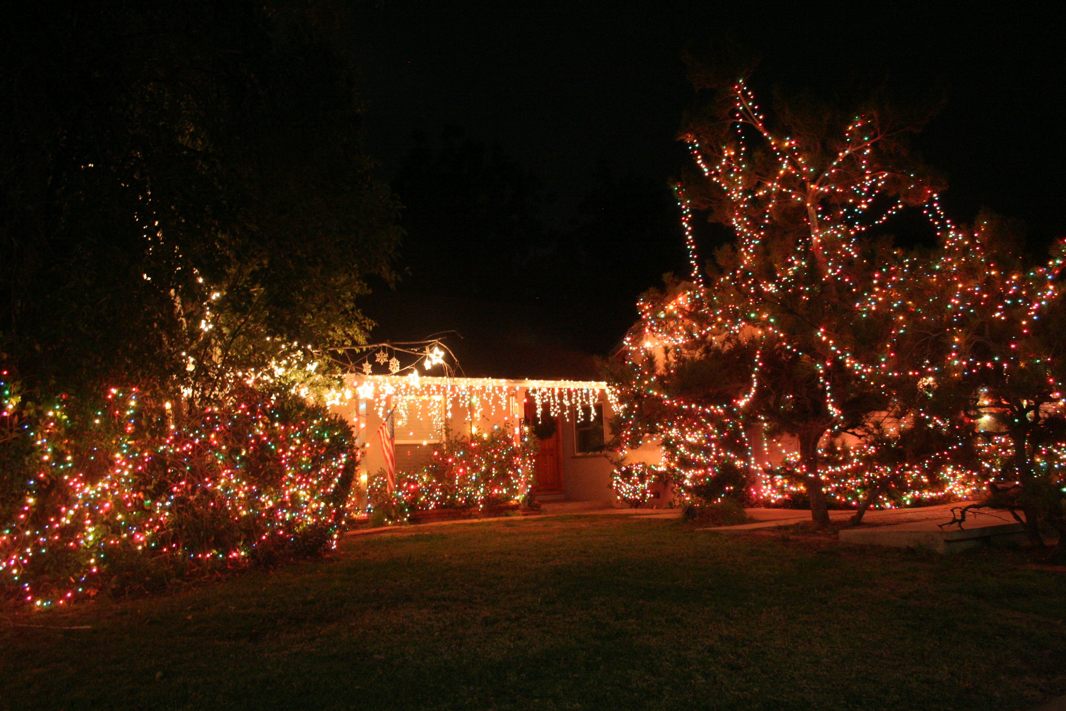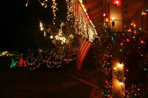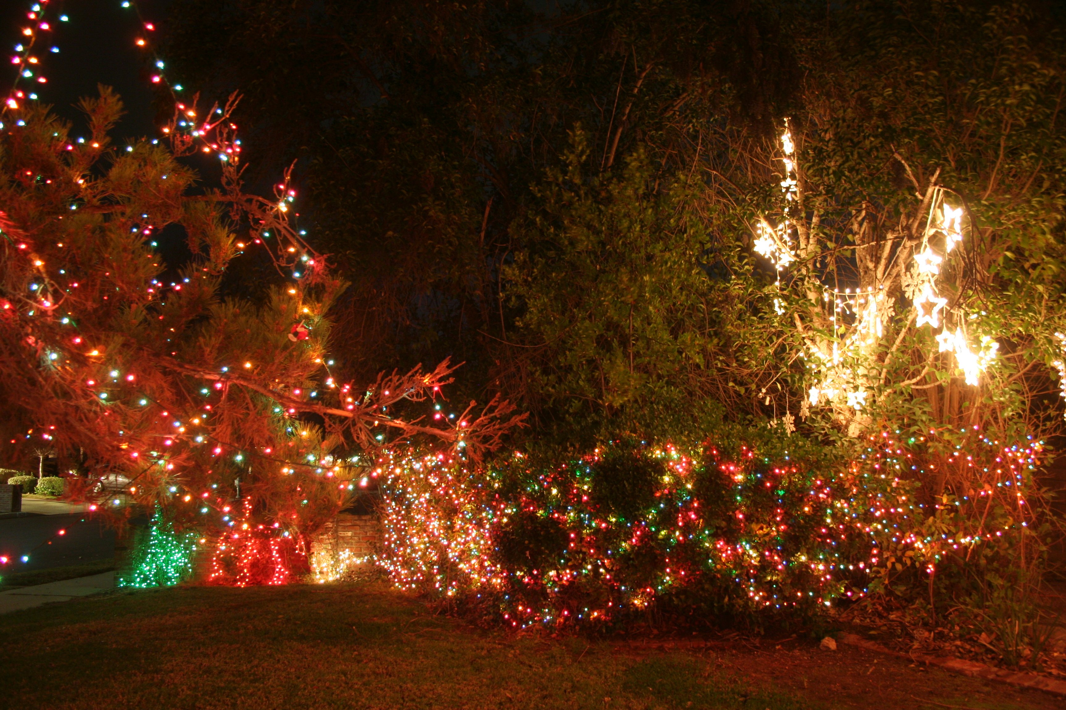 The bushes below the white stars would normally have at least one more set of lights and the big berry tree to the left of the white stars would have at least a couple of strings up high in the branches.