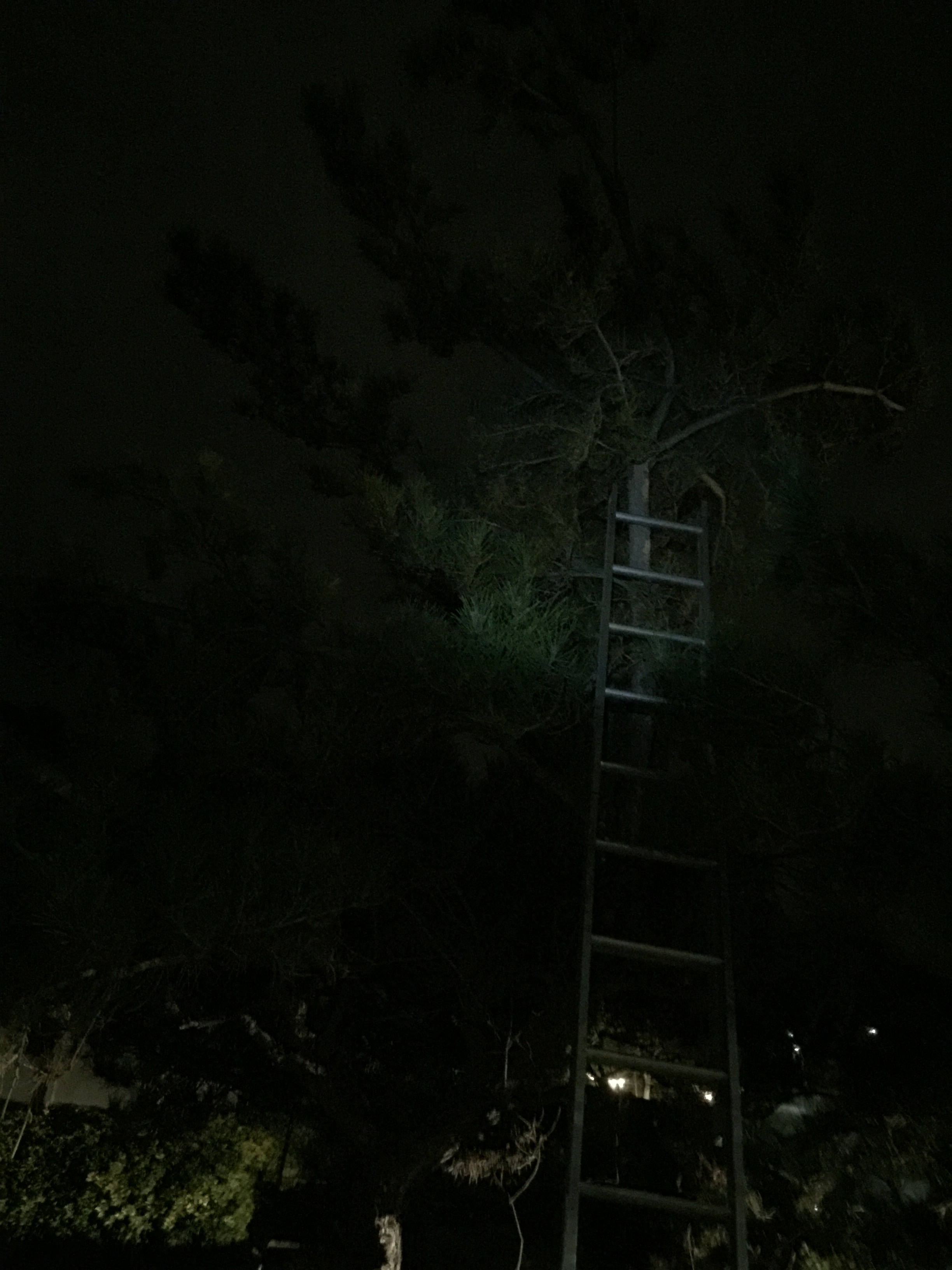 The spirit of Calvin took over my brain. I wasn’t 90% blind in the dark with a flashlight on my forehead standing fifteen feet up in a tree precariously balanced while wielding a long stick with a hook in order to take down Christmas lights! NO!