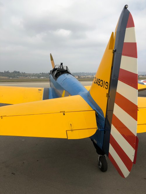 The brightly colored tail is rakish – the color combo is spectacular. (It also makes you easy to spot after an “off-field” landing, a good thing if you’re a training aircraft!)