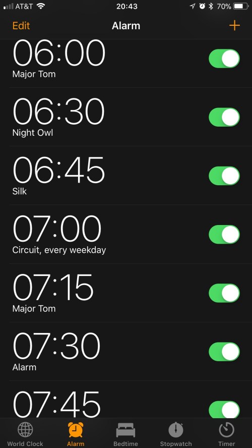 Now, were I to be given the choice, up by the crack of noon would be about right. Those signing my pay check have other thoughts, but one of the best things about my current job is that I’m only ten minutes away, so I can push that snooze button quite a bit before scrambling to hit the road.