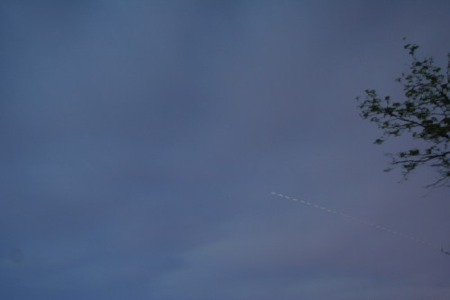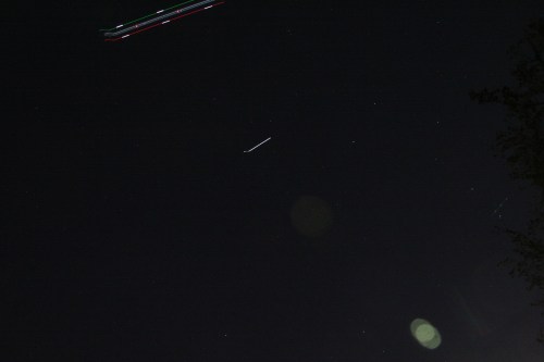 Well, not a terrible WAG, but next time I might want to go down to 3/4 second or even 1/2 second. In this image you can see the ISS, but the contrast between it and the background sky is much less distinct. (And I was up at the park instead of in my front yard, so the setup time on the tripod was even shorter and obviously less successful.)