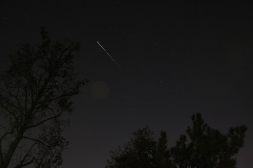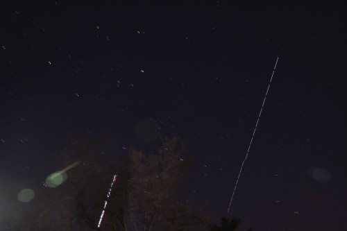 Yesterday, April 10th, there was one of the best passes I’ve seen in a couple of years. Rising out of the northwest headed straight toward (almost) the zenith, being chased by a Southwest Air 737 going into Burbank. (Four-second exposures, combined using StarStax 0.70.)