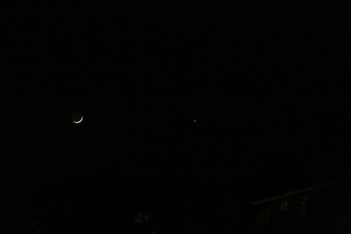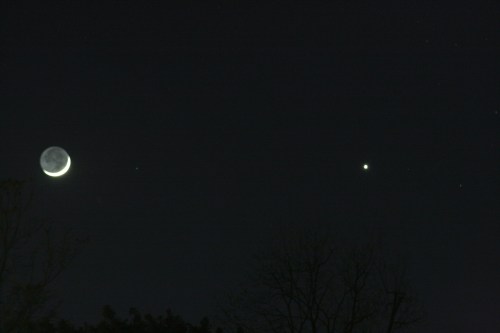 The two-day old moon is on the left (370,557 km away), Venus on the right (225,892,785 km away).