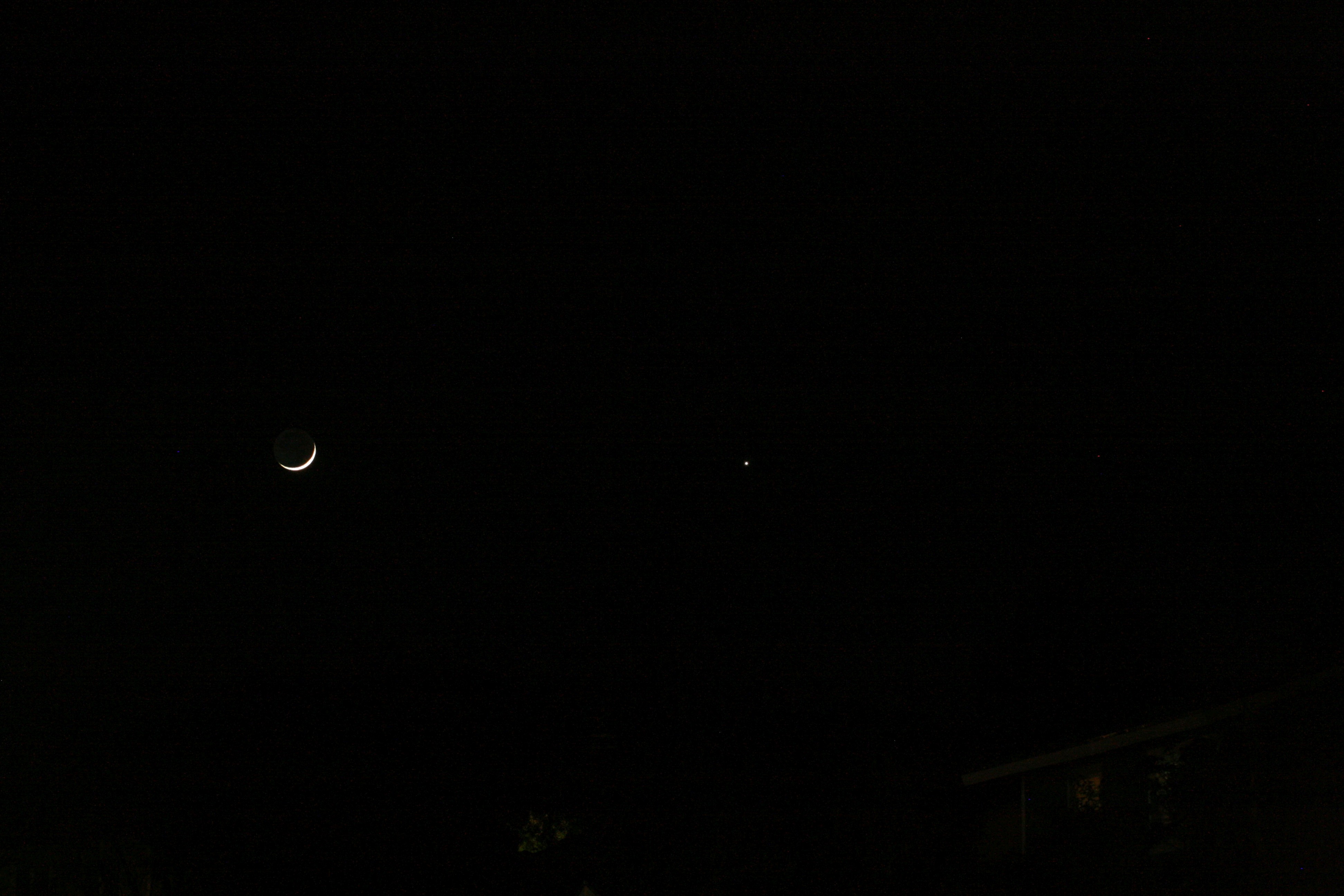 The two-day old moon is on the left (370,557 km away), Venus on the right (225,892,785 km away).