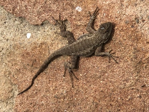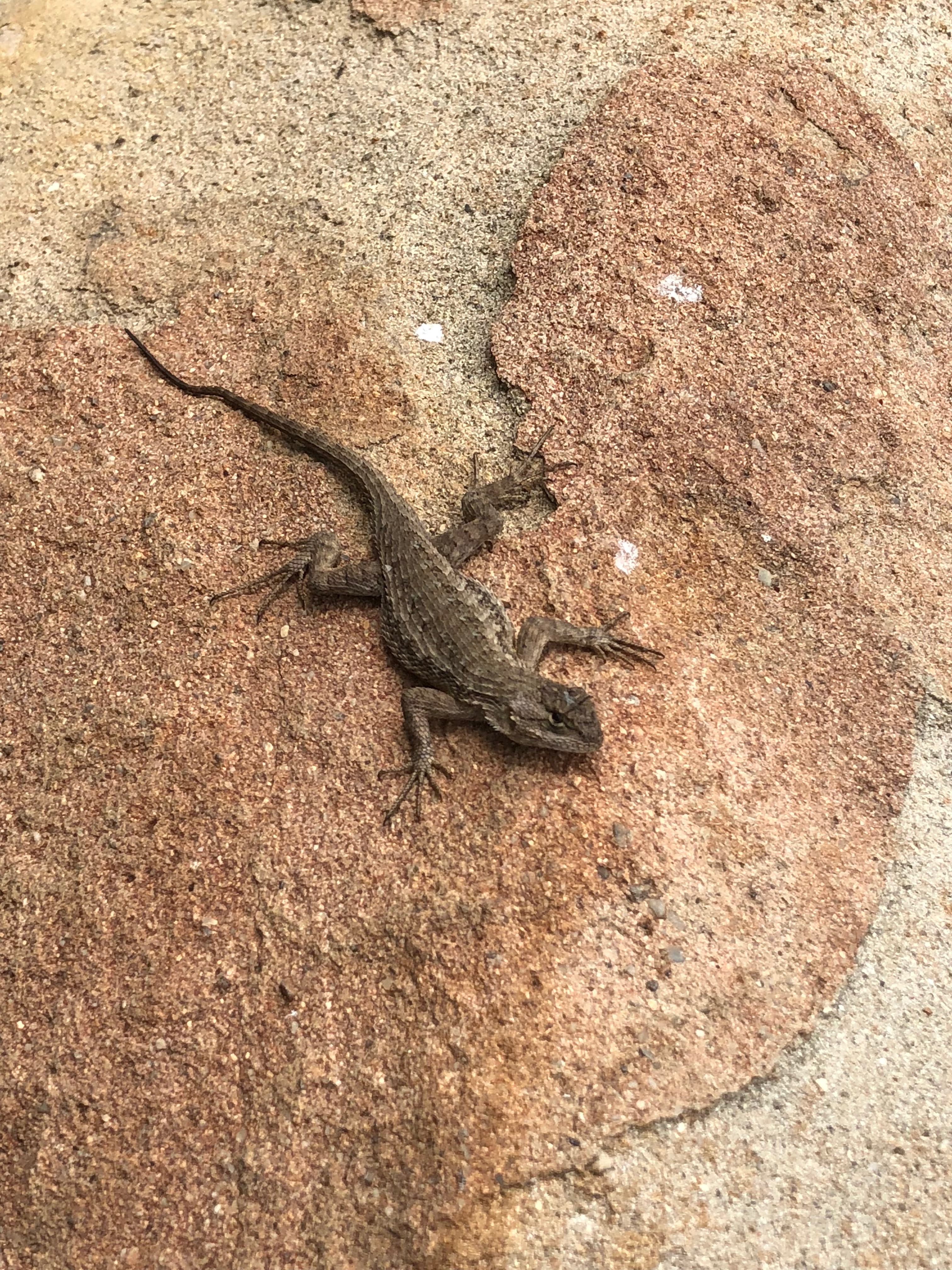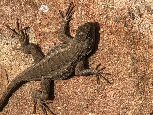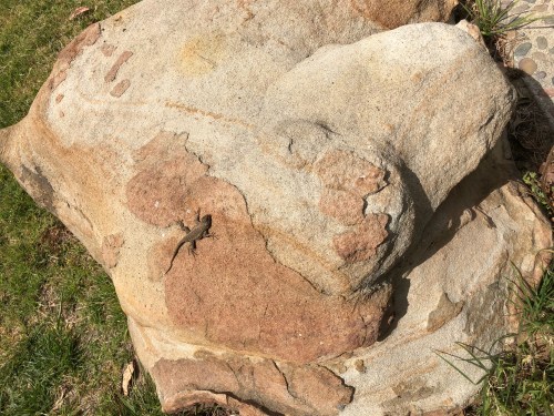 I don’t know if this is Fearless Fred from the other side of the yard, but he didn’t seem to bothered to have folks walking by just a couple of feet away all day, and even when I was holding the phone less than four inches away to take the last picture, he just sort of cocked his head and gave me that beady, reptilian stare.