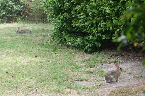 Shortly after this picture, these two bolted for the street to cross over into the neighbor’s hedge. They were closely followed by two more who I had been totally unaware of, lurking in the bushes.