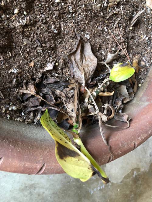 I watered and fed, but it wasn’t any good. By the end of March, there was nothing but the long, ropy stem with no leaves at all.
