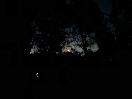 Far, far off, beyond the Hollywood Hills and (probably) Griffith Park, through the late evening haze and gathering coastal marine layer, tonight I spotted the moon rising so orange and dark that it looked like it was eclipsed.