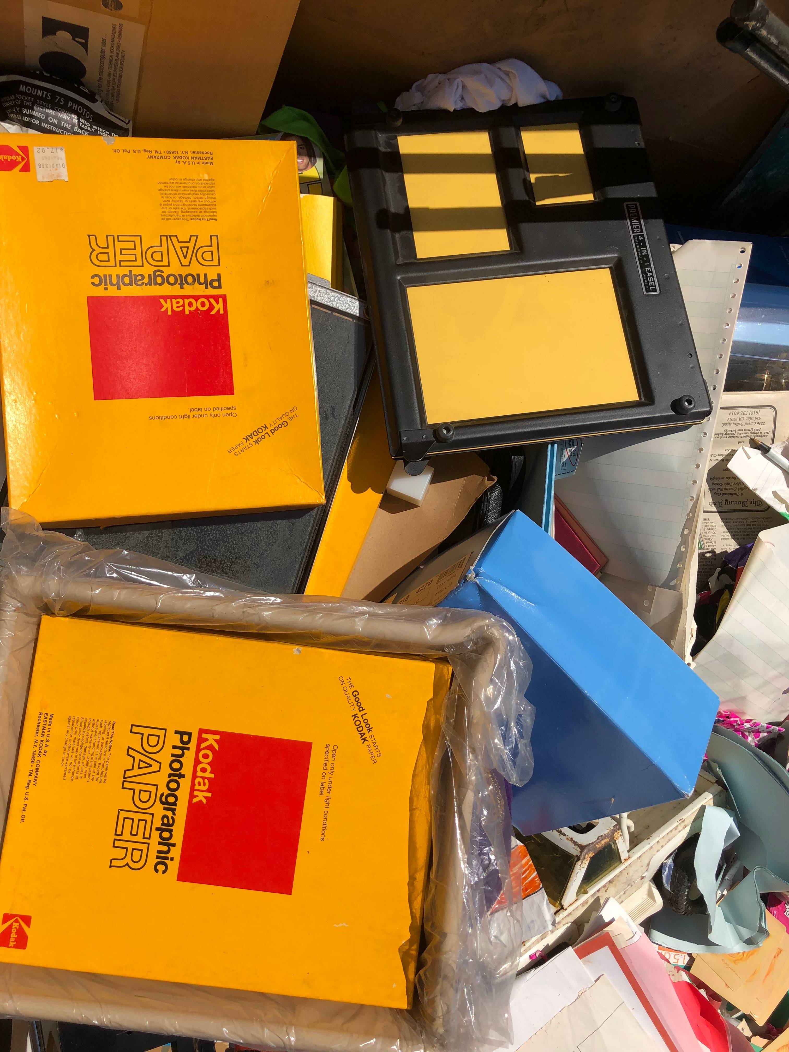 But in this moving and donating and trashing frenzy, my brain finally pushed to the point where it was capable of making the tough decisions, the darkroom equipment all went into the trash. The little light-tight canisters for developing film. The boxes of photo paper (which no doubt had become useless years ago just through exposure to heat and time). The frames used to make nice borders on 8×10, 4×5, and wallet sized photos. The frame for holding negatives and making proof sheets. The trays for holding the developer, stop bath, and fixer as I made prints. The boxes of cloth gloves and sleeves for holding negatives.