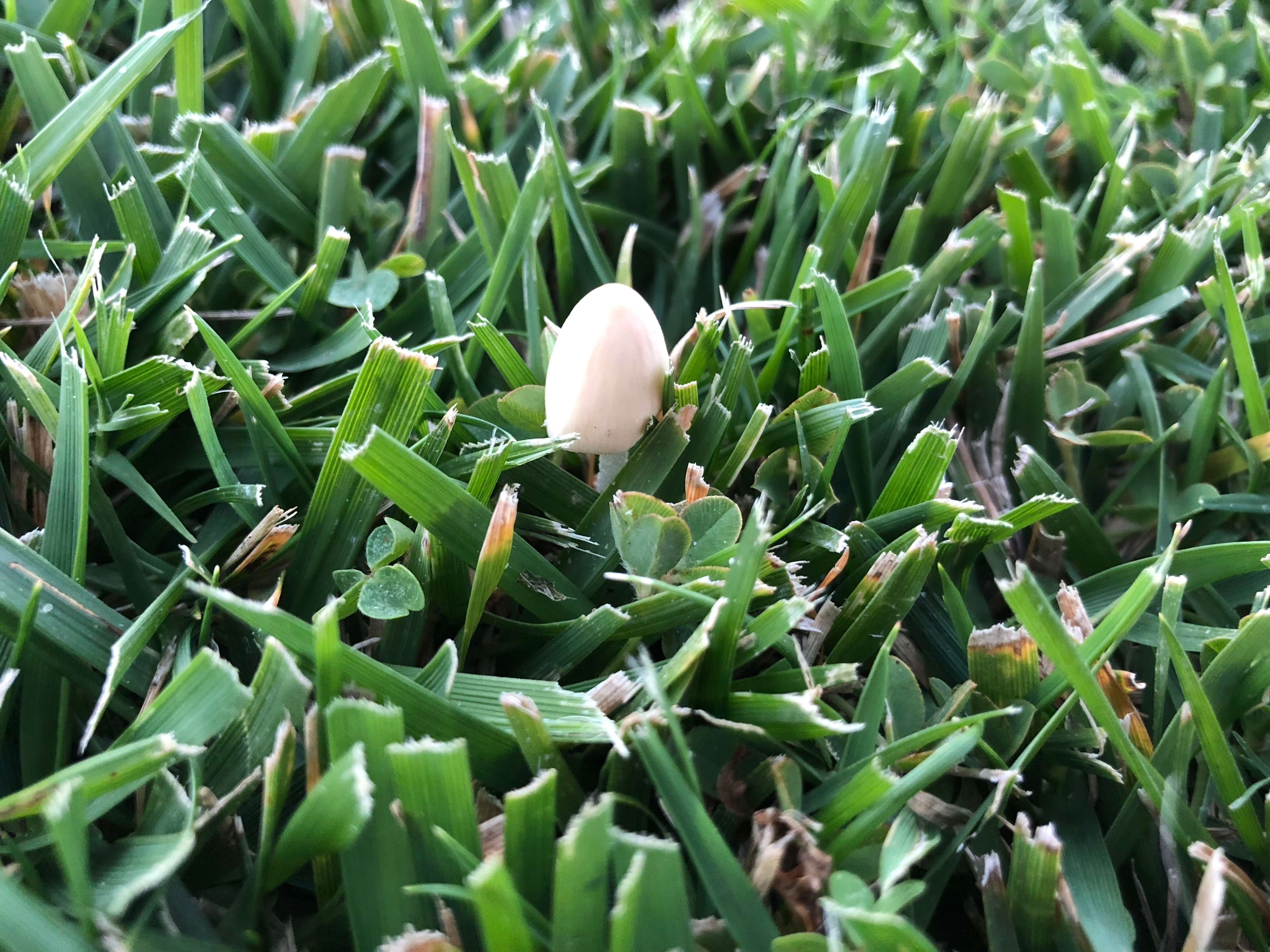 You’ve seen that the new front yard occasionally sprouts mushrooms (here, here, here, here, and here) but it’s been a losing battle against the gardeners’ lawn mowers. The lawn gets mowed on Thursday, so popping up on Monday gives you a three-day lifespan, while popping up on Saturday only gives you five days.