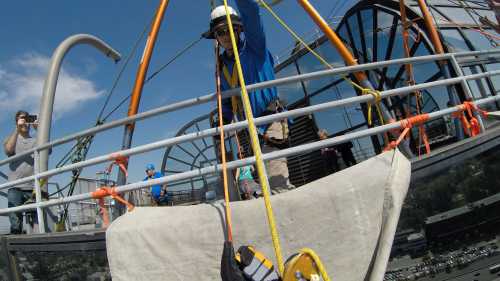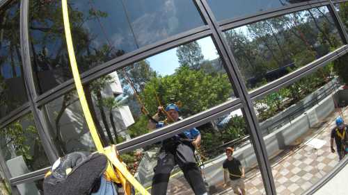 Starting to lean back, get the feel of the clutch release, practicing feeding the rope up. Something on the order of 280 to 300 feet of that rope is heavy! And that pool looks very, very small.