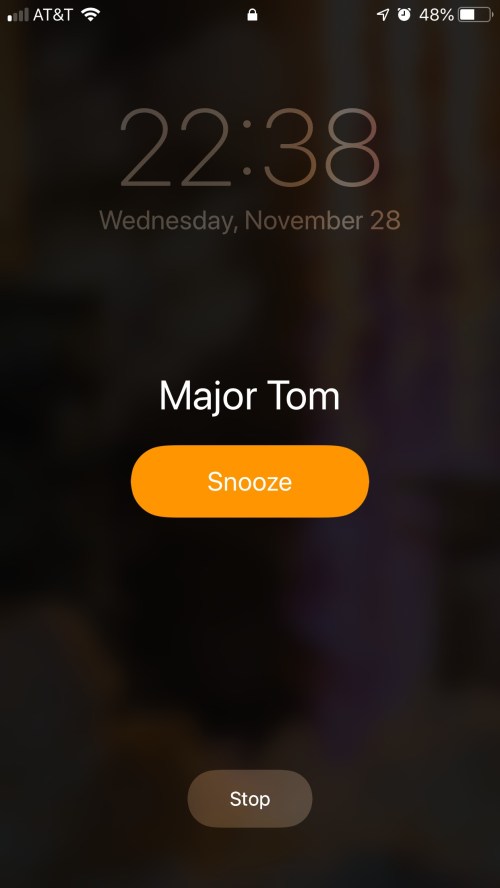 When a pre-set alarm goes off (not the timer), the huge yellow button that’s prominently displayed in the middle of the screen is to “Snooze” and have the alarm go off again in eight minutes. The smaller, more obscure button on the bottom of the screen is to “Stop” the alarm.
