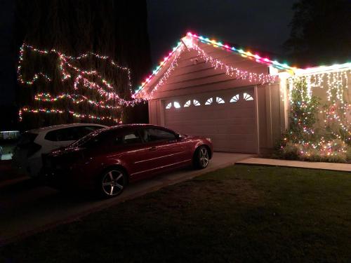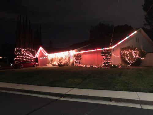 The lights first started going up after Thanksgiving and it’s obvious that I’ll never have as many lights here as I did at the old house. (Who knew in 2016 when I wrote that, thinking it was the last year at that house, that we had one more to go – but now we’re out.) There’s just not as much surface area to the house, and there are far, far fewer trees and bushes and foliage to drape lights on. But this isn’t bad for what I’ve got.