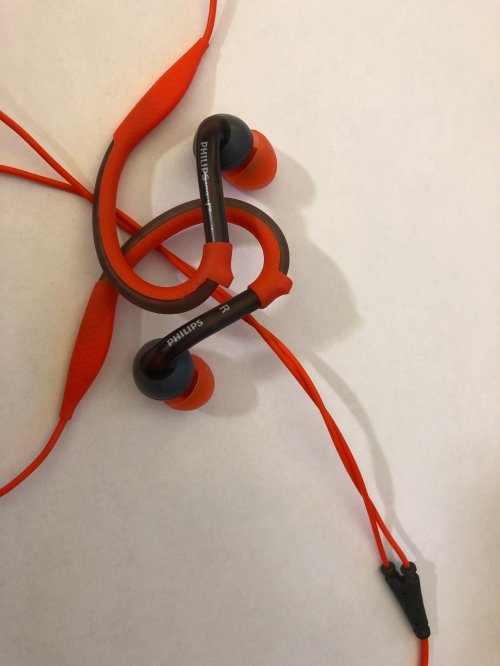 The orange set is from Philips – it might be made by the “Philips” that’s the huge electronic conglomerate that has a lot of high end stuff, but for something I impulse bought on Amazon I wouldn’t bet my life on it. These are more simple than the green Musco set, lacking the in-line controls that I never use to begin with. But they fit pretty well (although not as über fantastic as the blue Sony set that is my gold standard) and the sound is much better than the Musco (although not as über fantastic as the blue Sony set that is my gold standard).