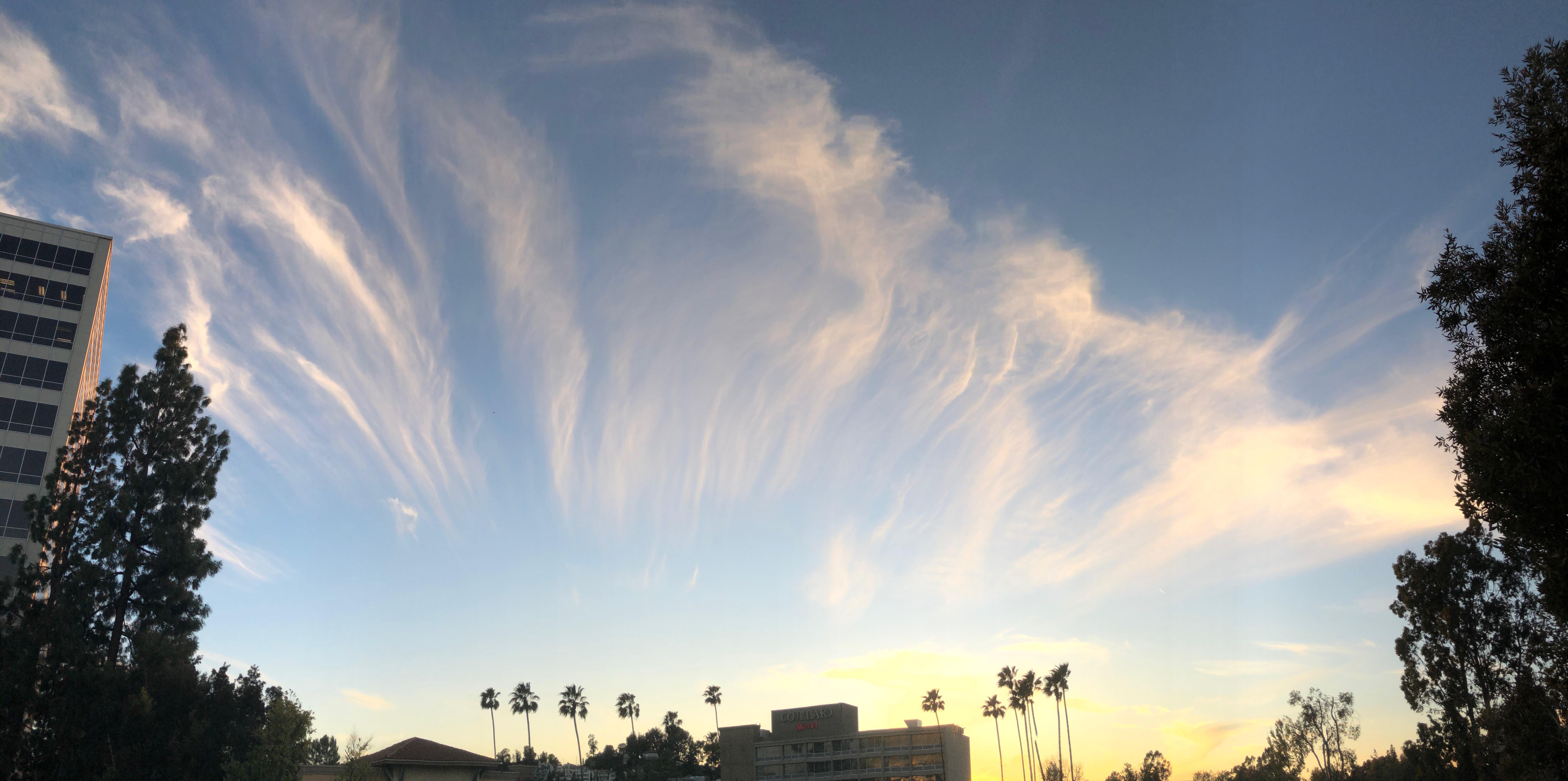 These high, thin, wispy cirrus clouds are often called “Mare’s Tails.” They were particularly lovely tonight at sunset over Southern California.