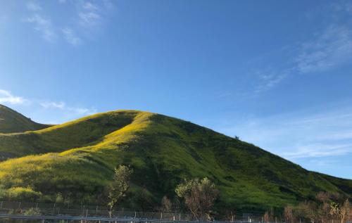 Five months ago, these hills were black and smoking, not a single green or living thing in sight. Our house and the west end of the San Fernando Valley is beyond those hills about four miles. The fire had started up there and then headed straight south, coming down over these ridges, jumping the 101 Freeway into Agoura, then south through Mailbu to be stopped only by the Pacific Ocean.