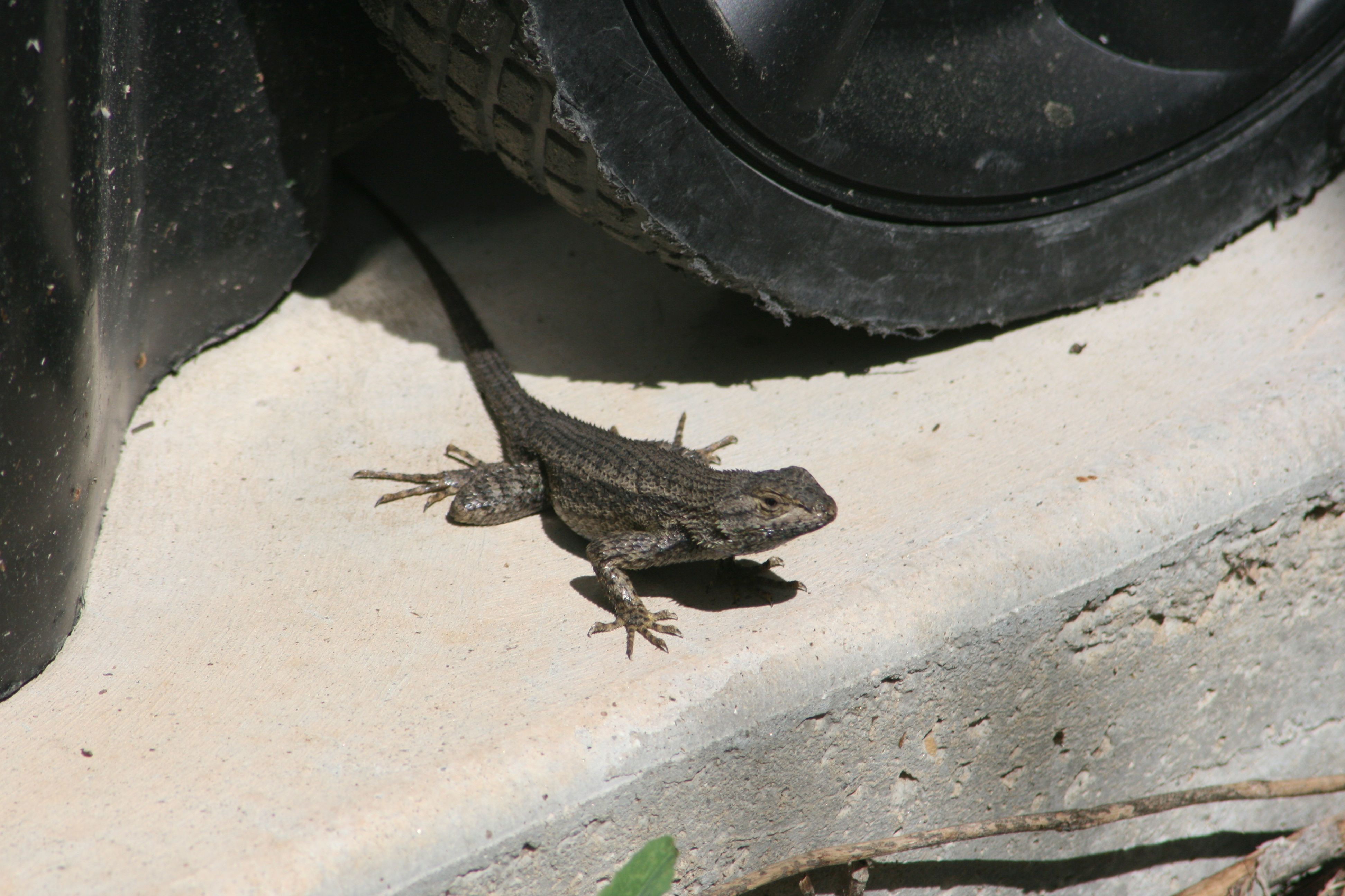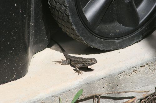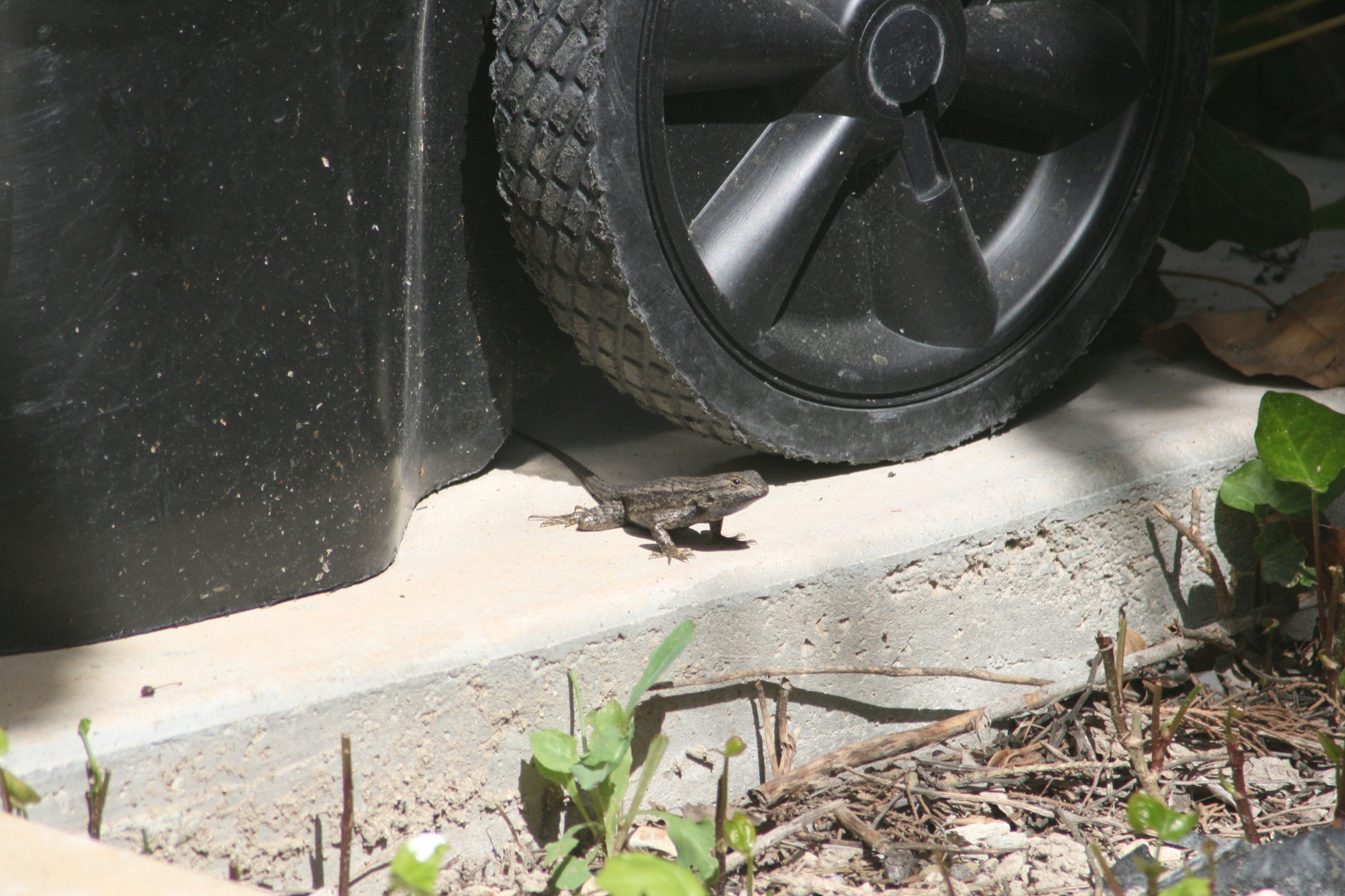 He was also pretty calm about standing his ground – I’m guessing that he’s pretty comfortable with the environment around the trash bins and the ivy and bushes immediately behind them, so he knew that he could get to cover very quickly. Most of the other lizards I see in the “new” house sun themselves more out in the open and are pretty skittish. This guy let me step up to within about seven or eight feet on this picture before he boogied.