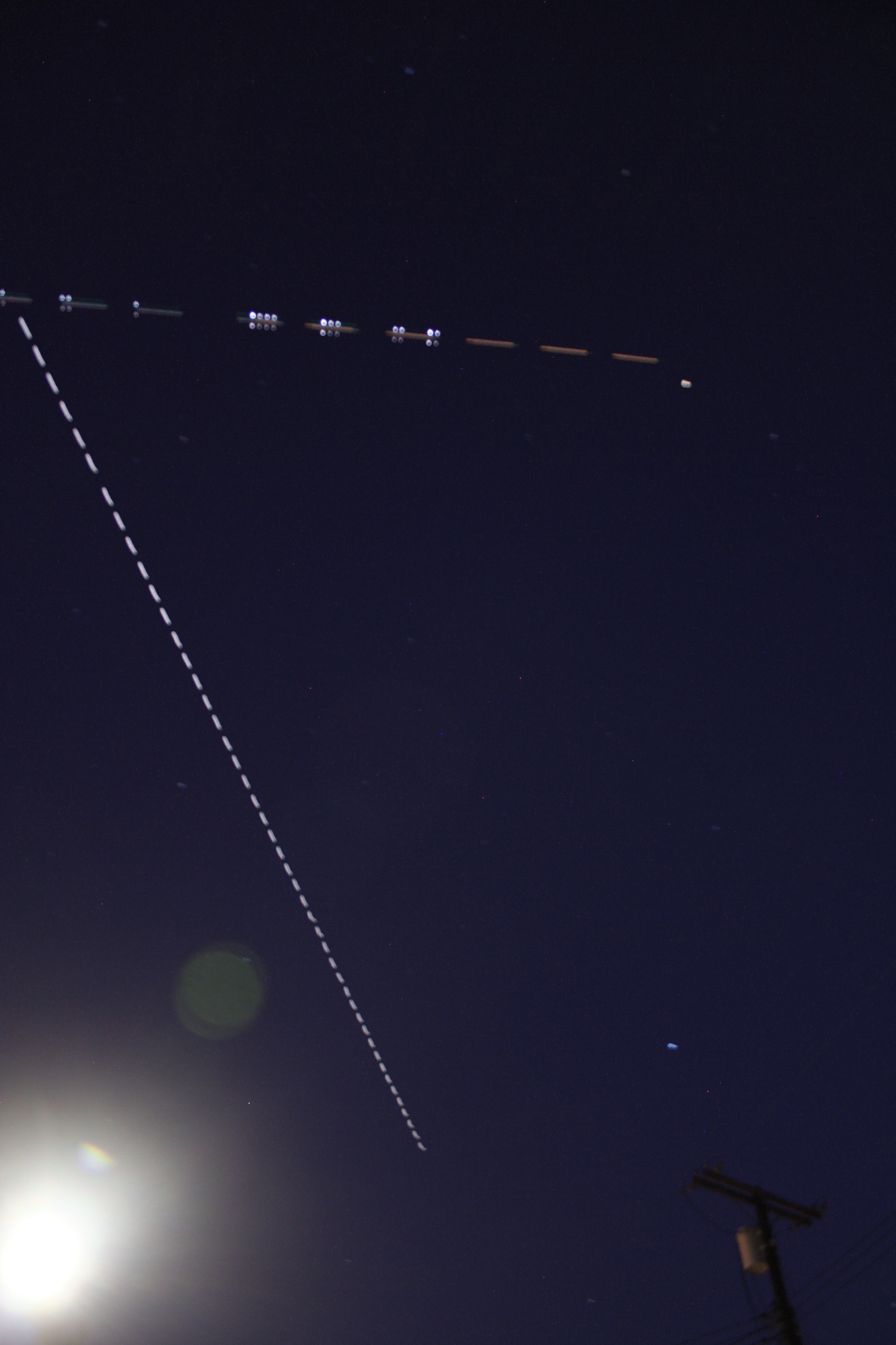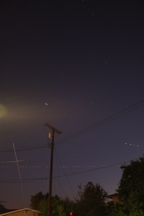 Going from the lower center to the upper left. I was in a hurry and at this angle it’s almost impossible to actually look through the viewfinder on the camera, so I couldn’t tell if I was aiming high enough to avoid the streetlight. (Narrator voice: “He was not.”) Still, this wasn’t bad. (Again, one second exposures at f3.5.)