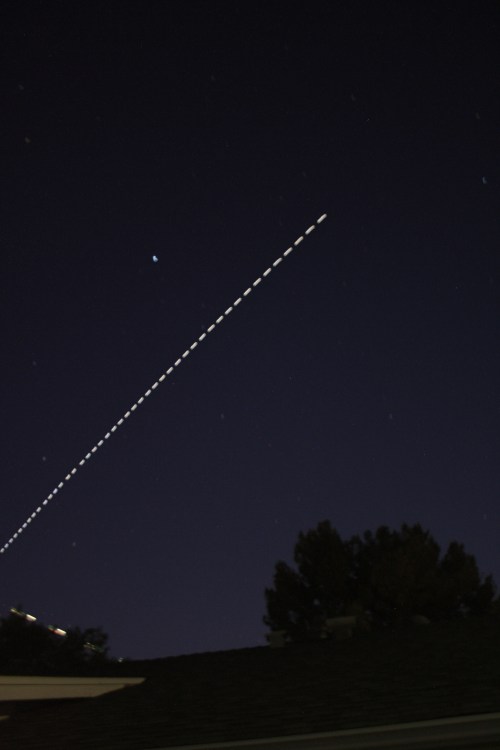 (The ISS is the white streak in the lower left, headed toward the upper left. The other, more horizontal streaks are aircraft.)