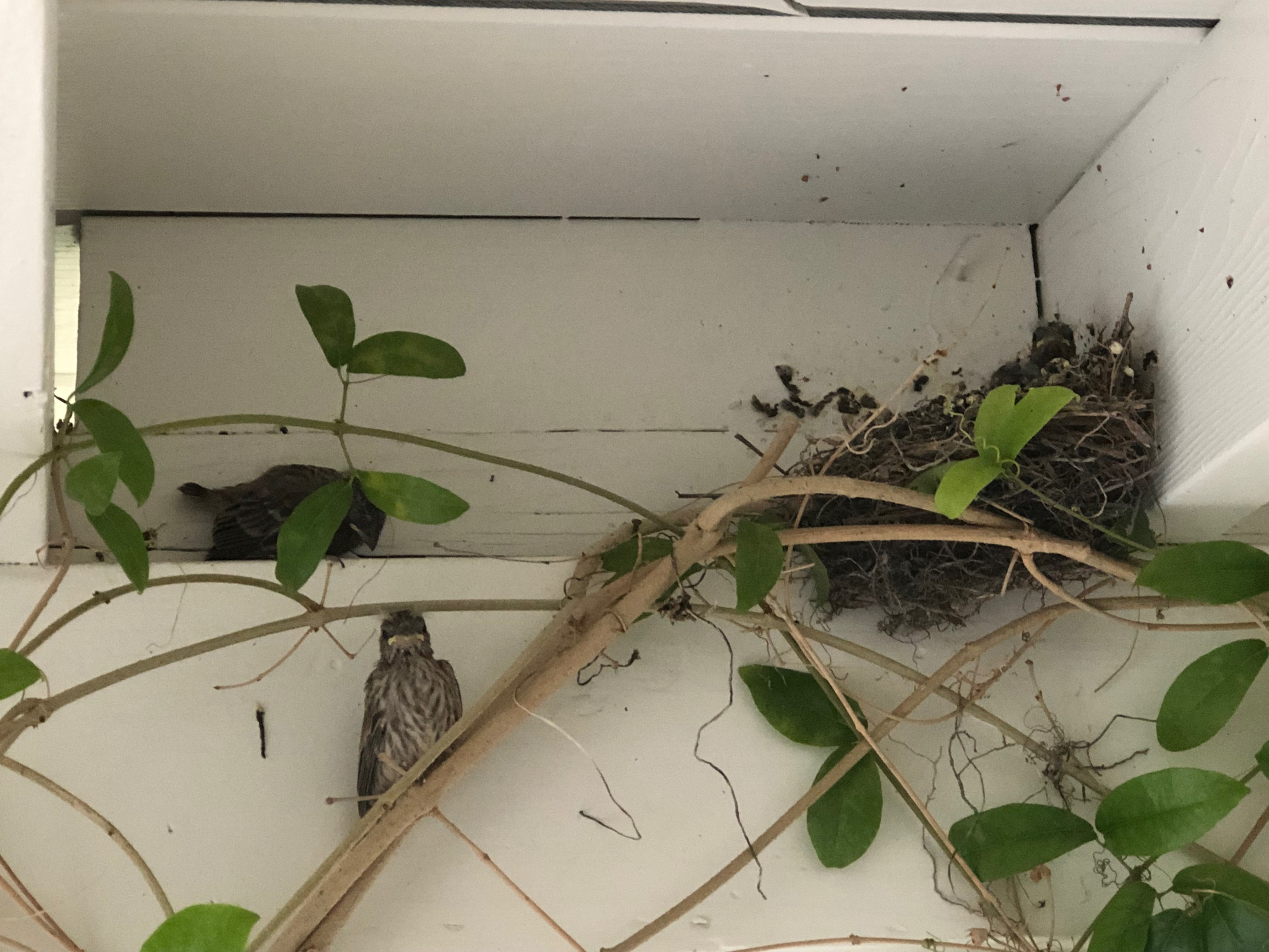 There’s the troublemaker, who was already out and down on the vines. I’m not sure that’s a good career move at this stage of life, but you do you, dude! Then there’s the one above them, not in the nest by out on the 4×8 beam. They must have gotten tired of being in that crowded nest, where the two “good kids” have stayed where they were told to.