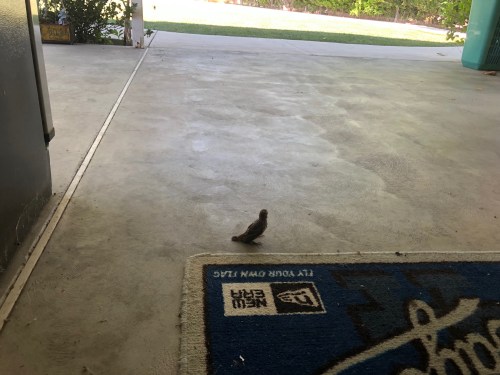 He wasn’t flying, he was hopping. I opened the door and he took off like a flapping little bat out of hell into the bushes. I let him go, despite my doubts about his life expectancy out of the nest.