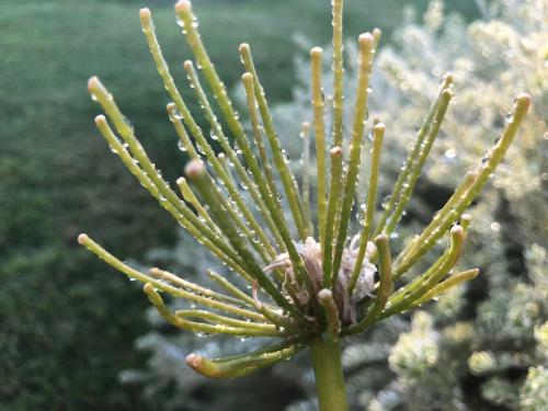 In the process, water got sprayed onto the bushes just in front of the porch, turning them into a zillion little prisms just as the sun set.
