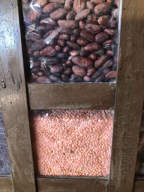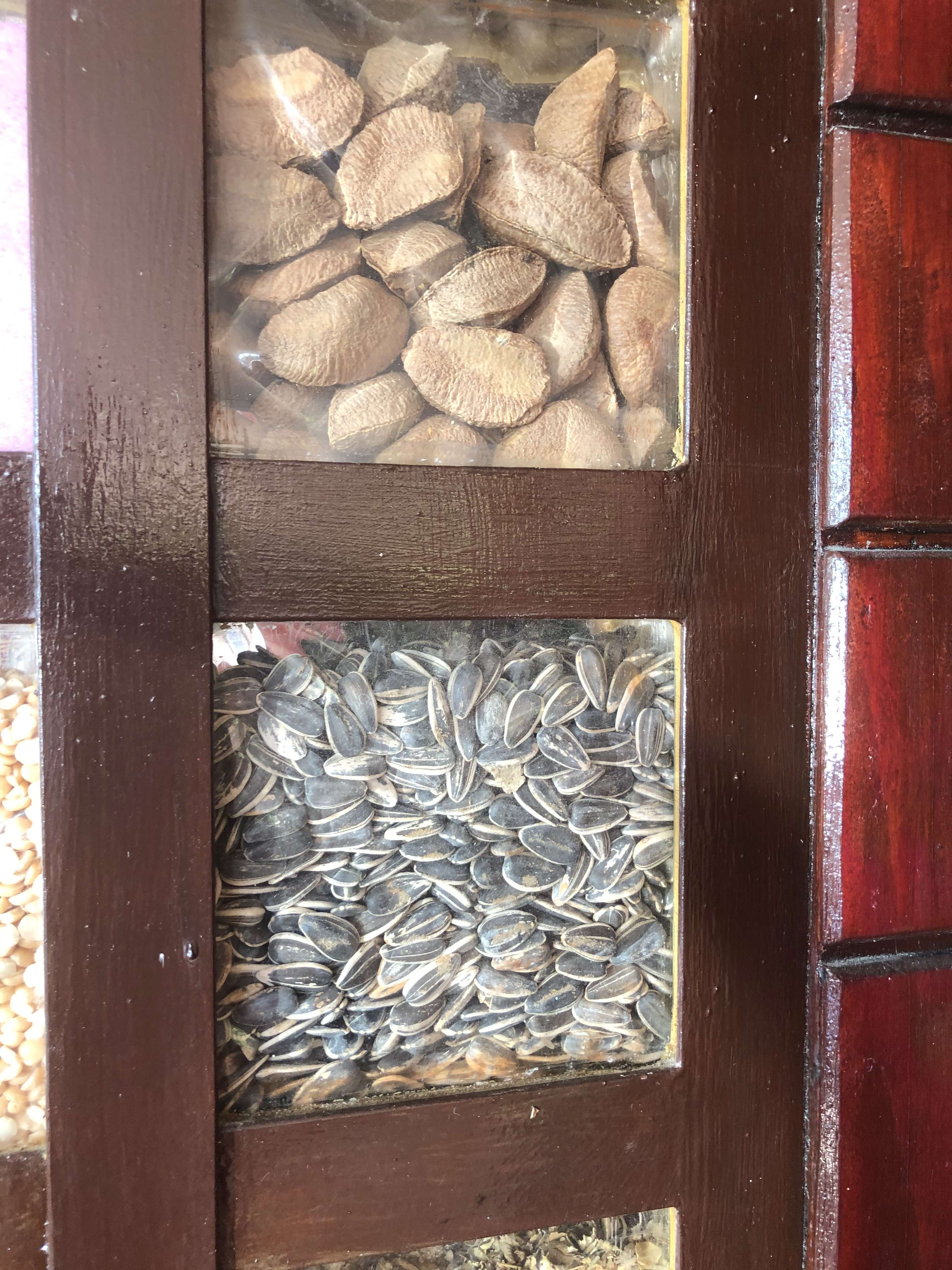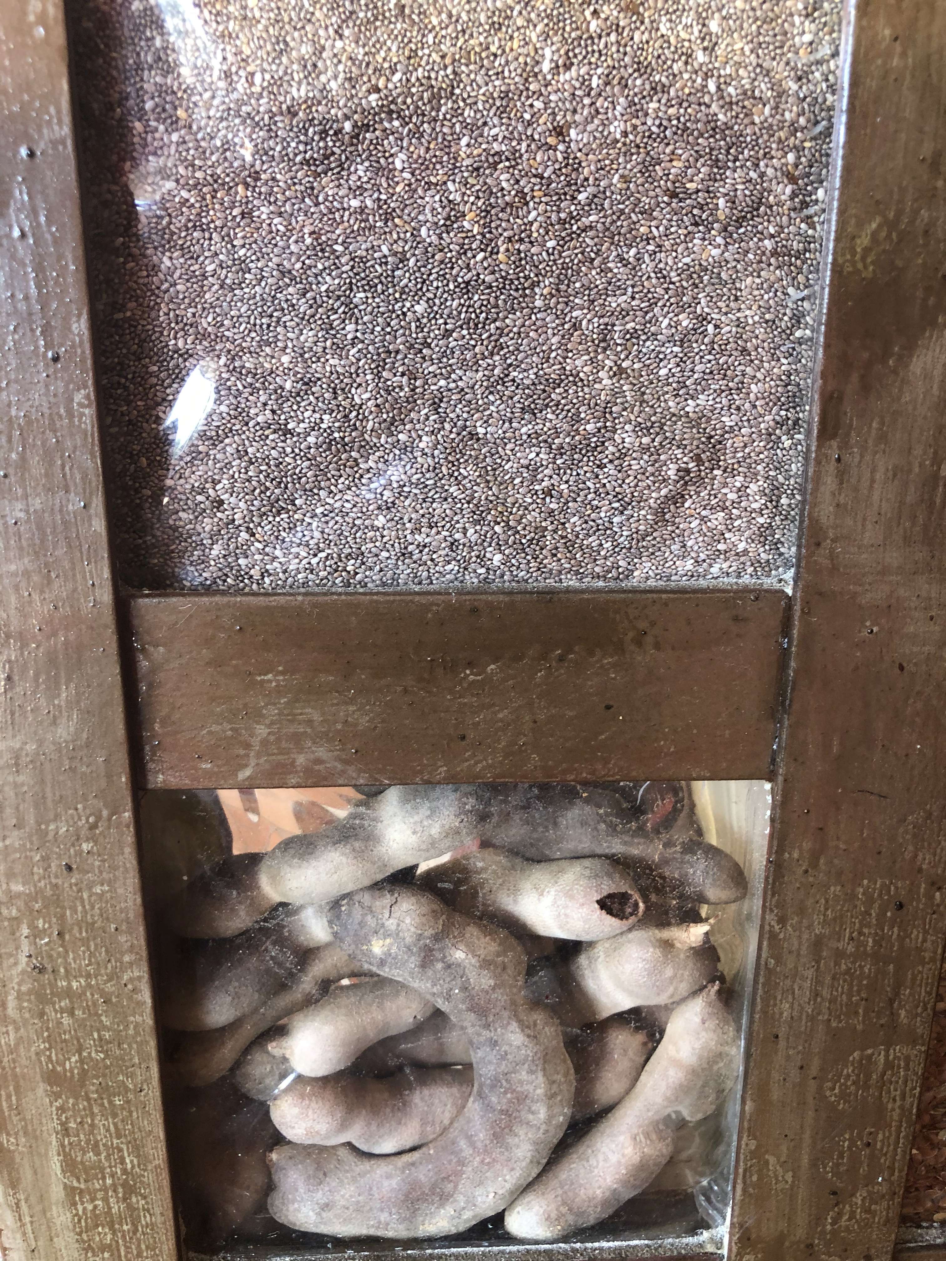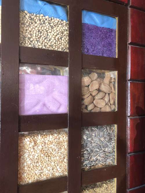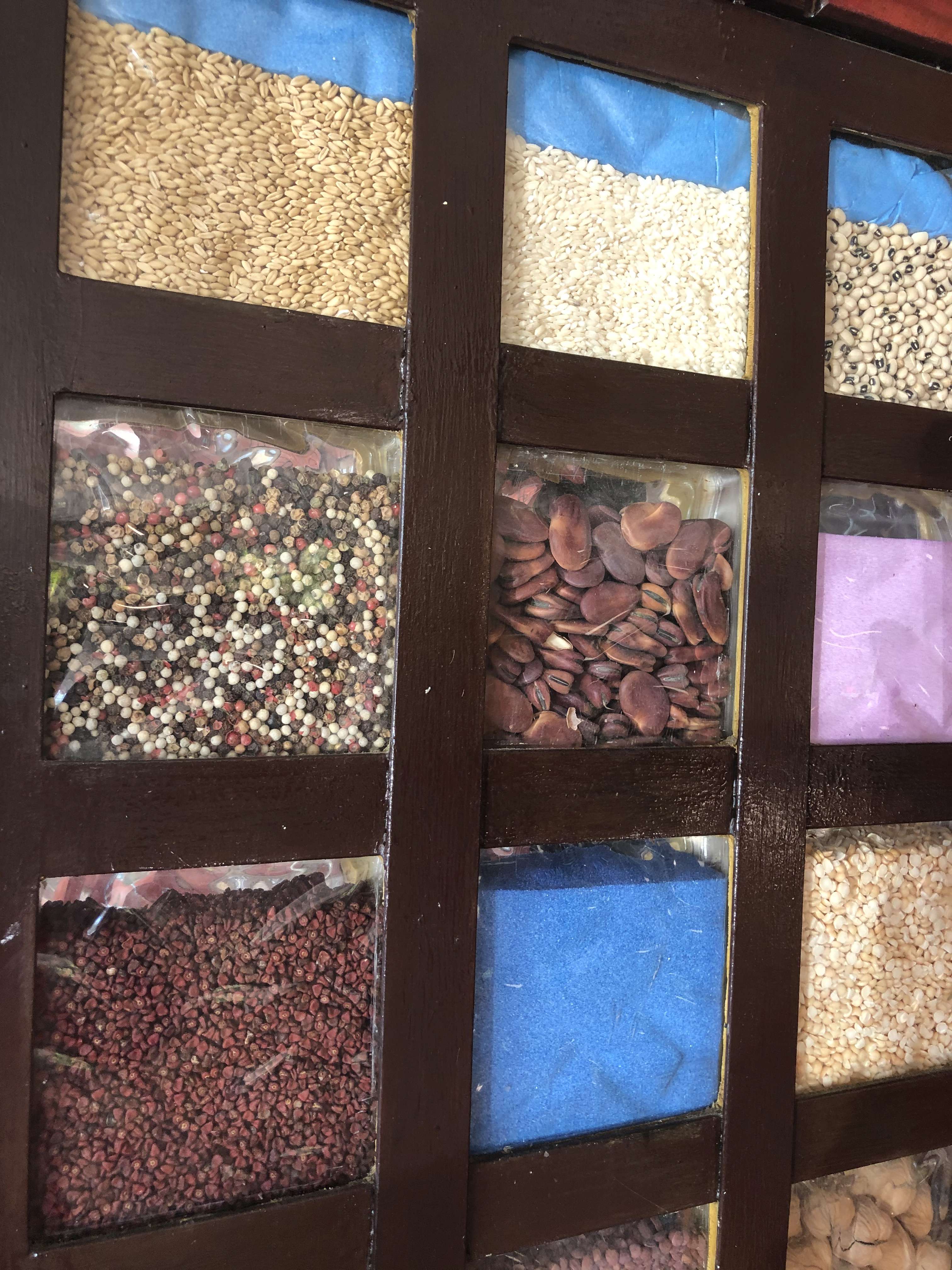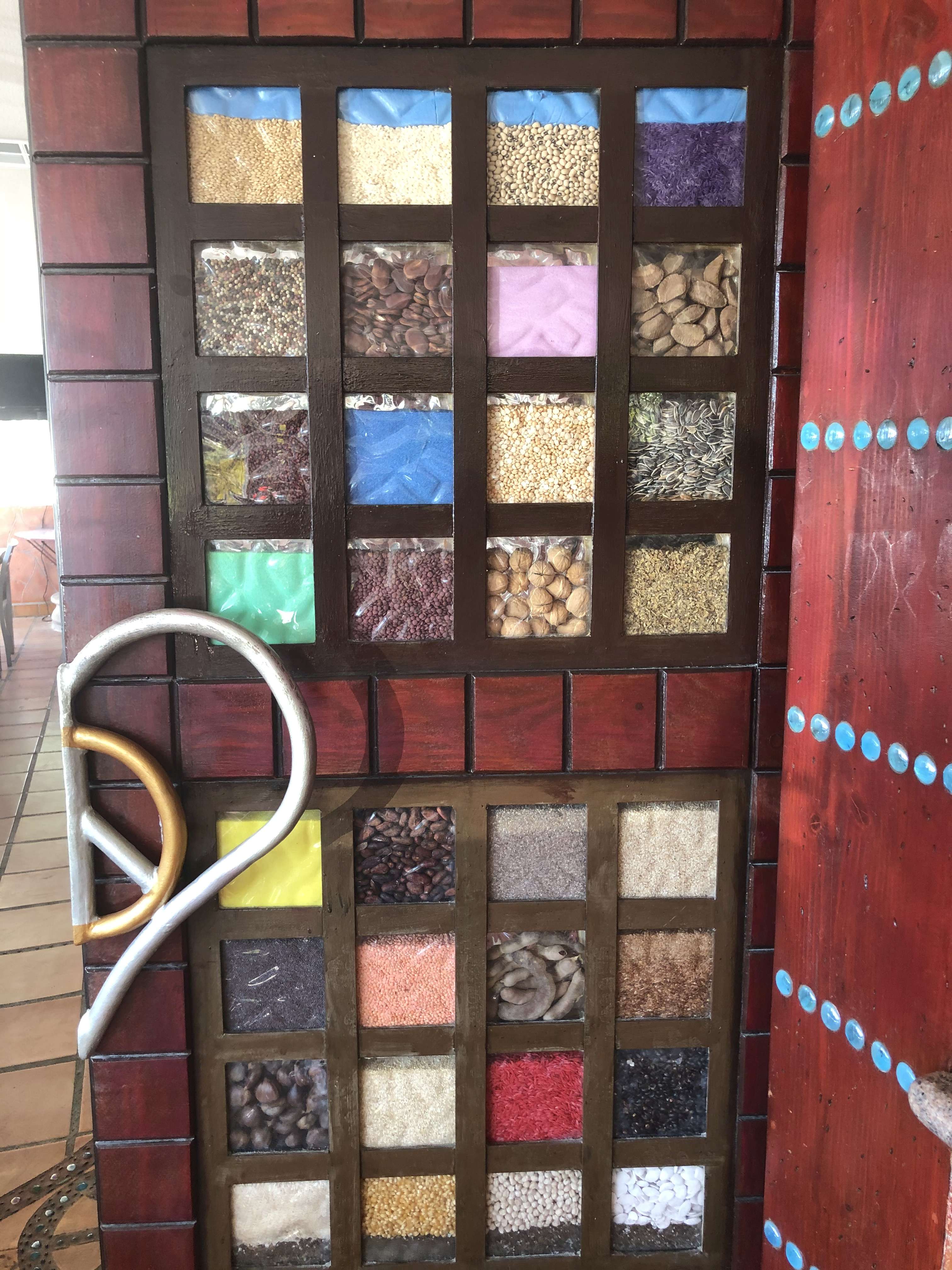 It was a mosaic of cells, each about 6 inches by 6 inches, and each filled with a different sort of seeds or nuts or spices.
