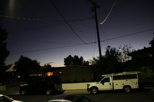 Look at that first picture in this post, the wide angle one – see that dot way up above the phone wires, over to the left a bit from Jupiter and Venus, sort of above the TV antenna on the neighbor’s house? That’s Saturn, trailing behind Jupiter on its way toward our morning sky. It will be passing Venus the week of December 9th, in about two weeks. So watch for a repeat of this sort of spectacle in your evening sky.