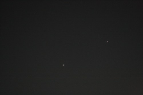 They stand out to the eye at sunset, both very bright. Venus is in the lower left, Jupiter in the upper right.