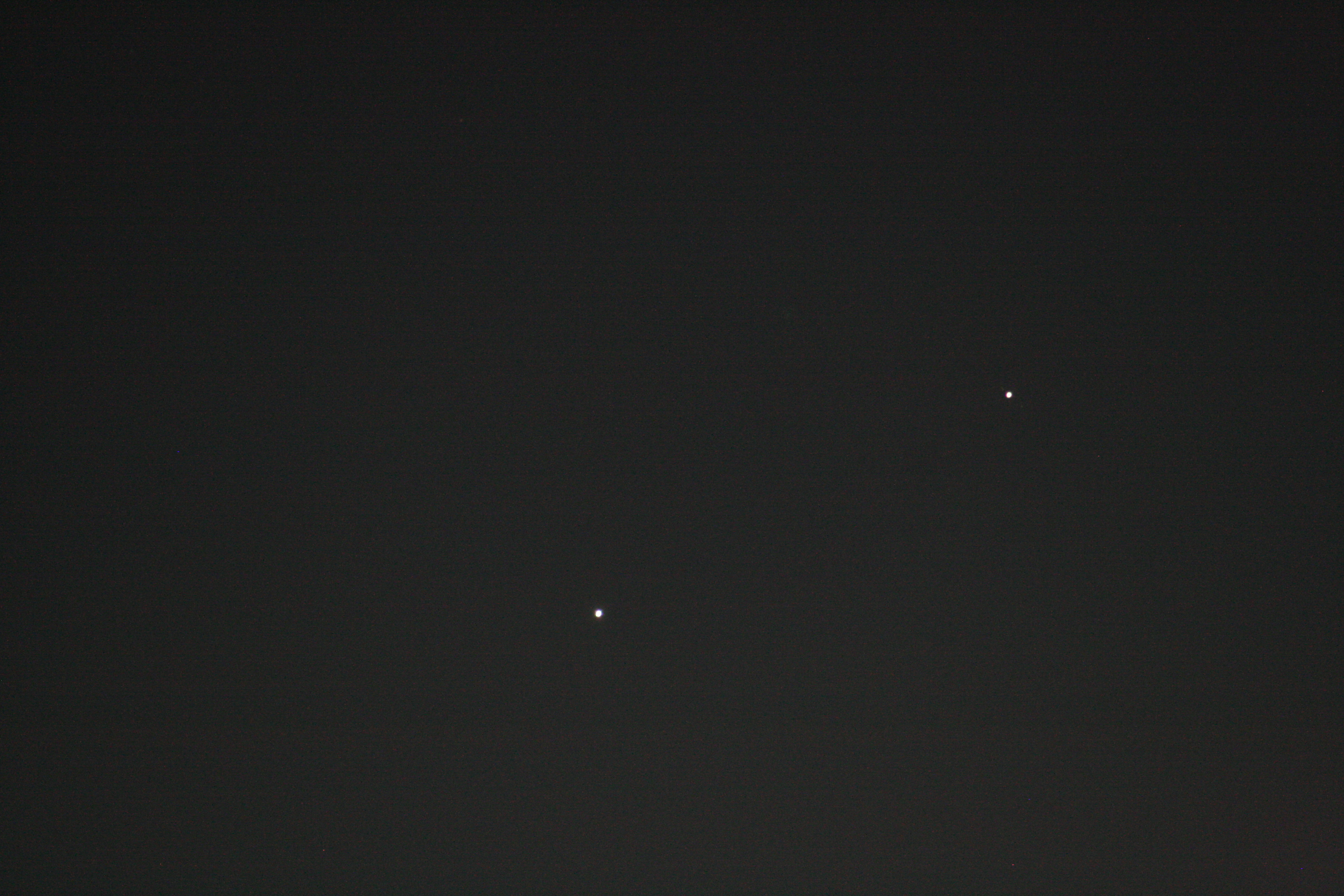 They stand out to the eye at sunset, both very bright. Venus is in the lower left, Jupiter in the upper right.
