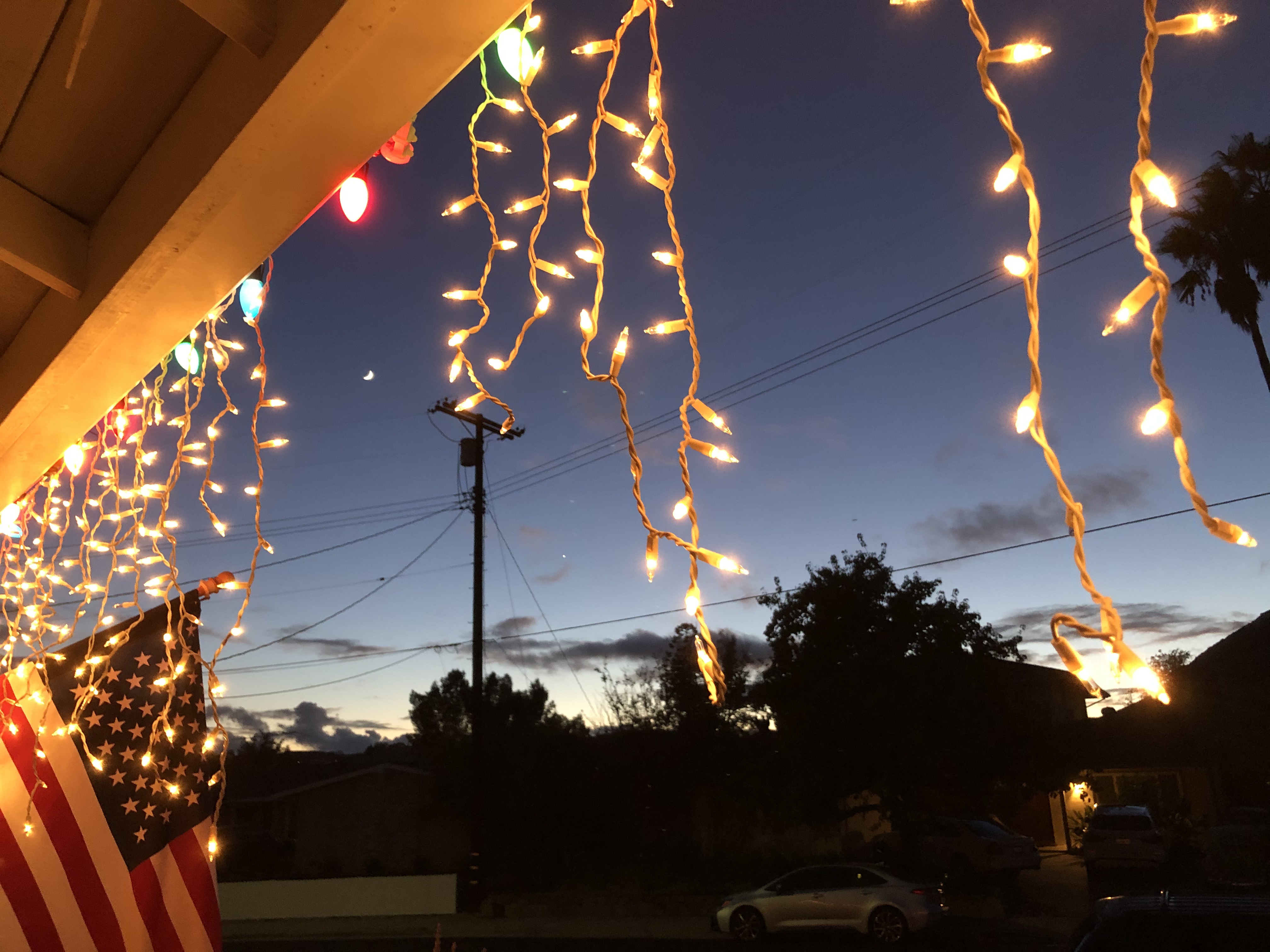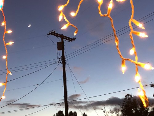 After a long day of putting up lights, while I was starting to put ladders and boxes and extension cords and tools away because it was getting dark, I spotted the crescent moon and bright Venus off in the west.