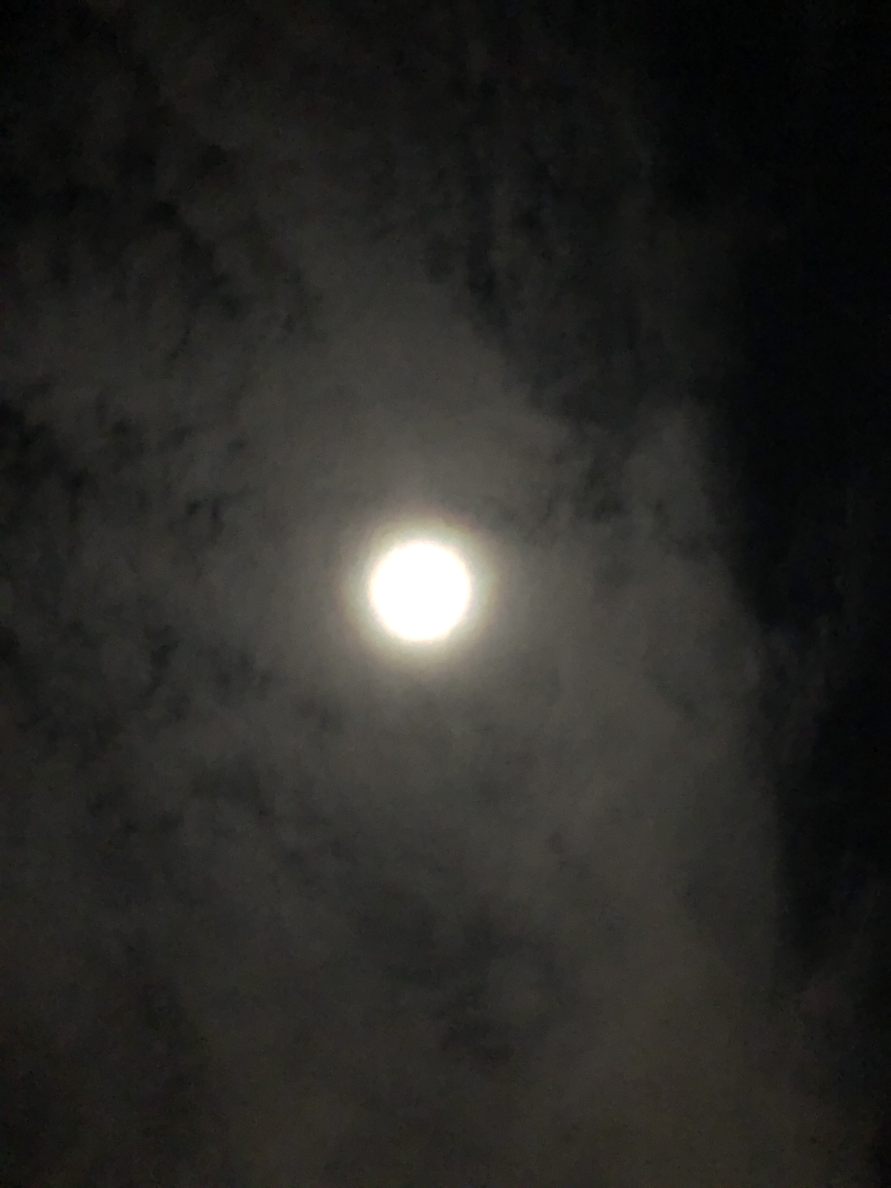 I went outside to take out the trash, grateful that it had stopped raining, even though it was cold. (As always, that’s “LA cold,” not “real cold.” In other words, 51°, not 11°!) Once I got out I could see that it wasn’t as dark as I had expected, with some moonlight and the clouds breaking up a bit after a week or so of steady rain.