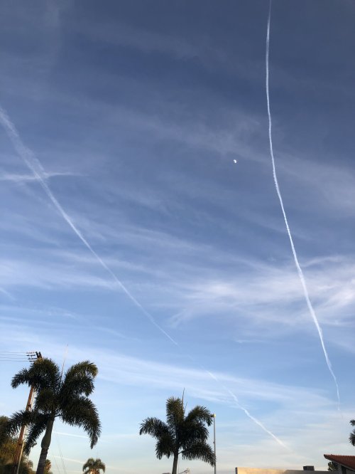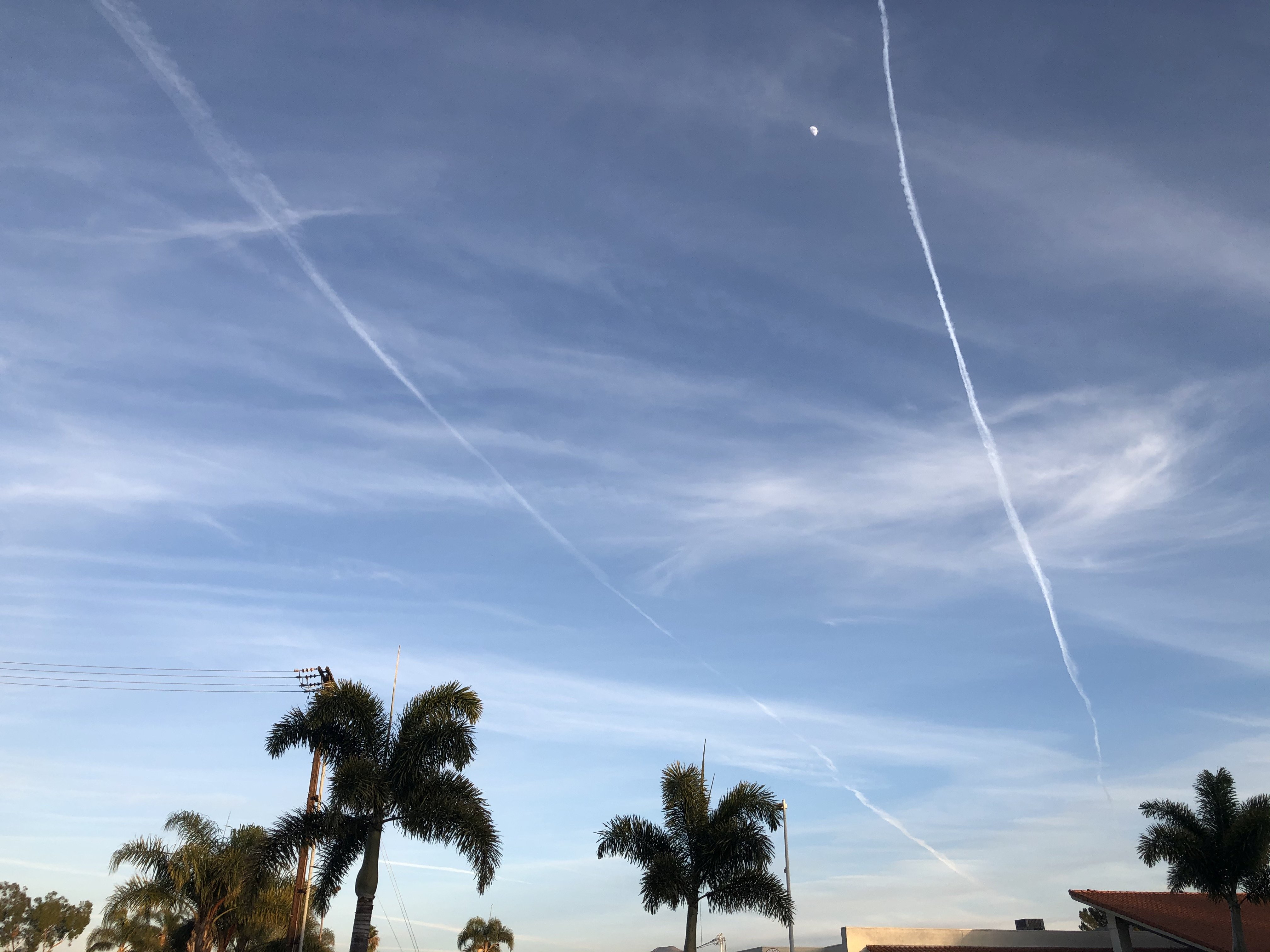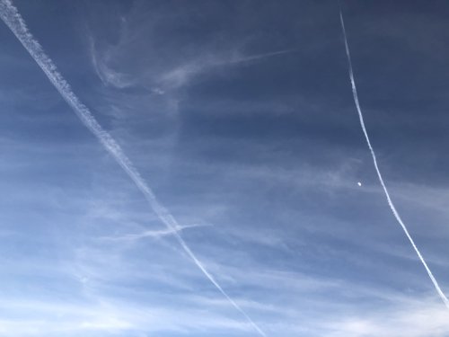 The moon seen through a broken, high layer of cirrus clouds, the sky being split by two horizon-to-horizon contrails.