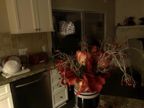 The lights might be down outside, but the tree’s still up – too busy this month to get to it yet. Late at night, when all of the other lights are off, you can see it reflected off of the china cabinet doors and the sliding glass doors and both and back and forth.