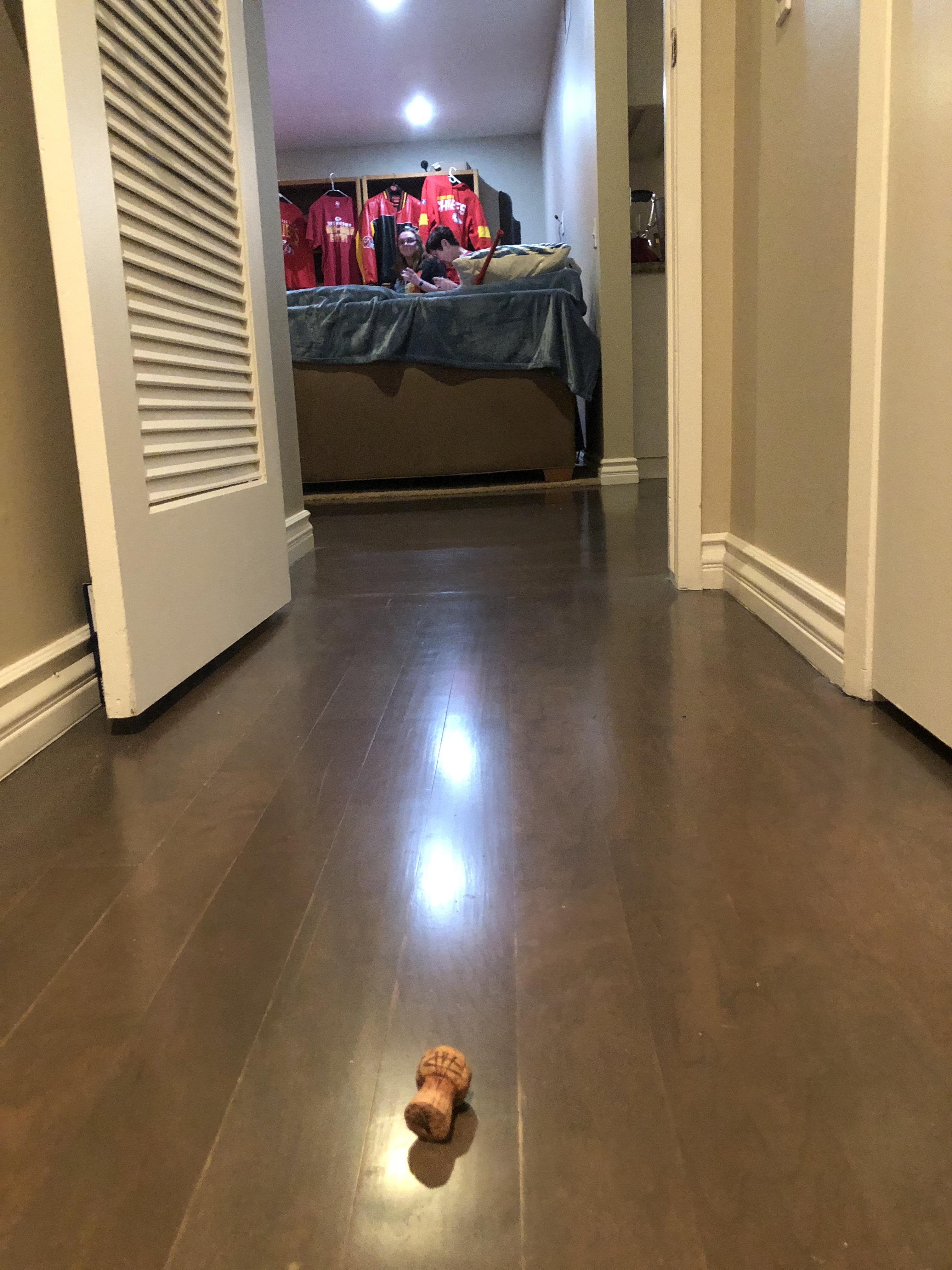 When we popped the cork on Sunday after our glorious victory, it took off from the kitchen, through the dining room, and down the hallway. I found it here later, lonely, forlorn, while the party continued in the other room.